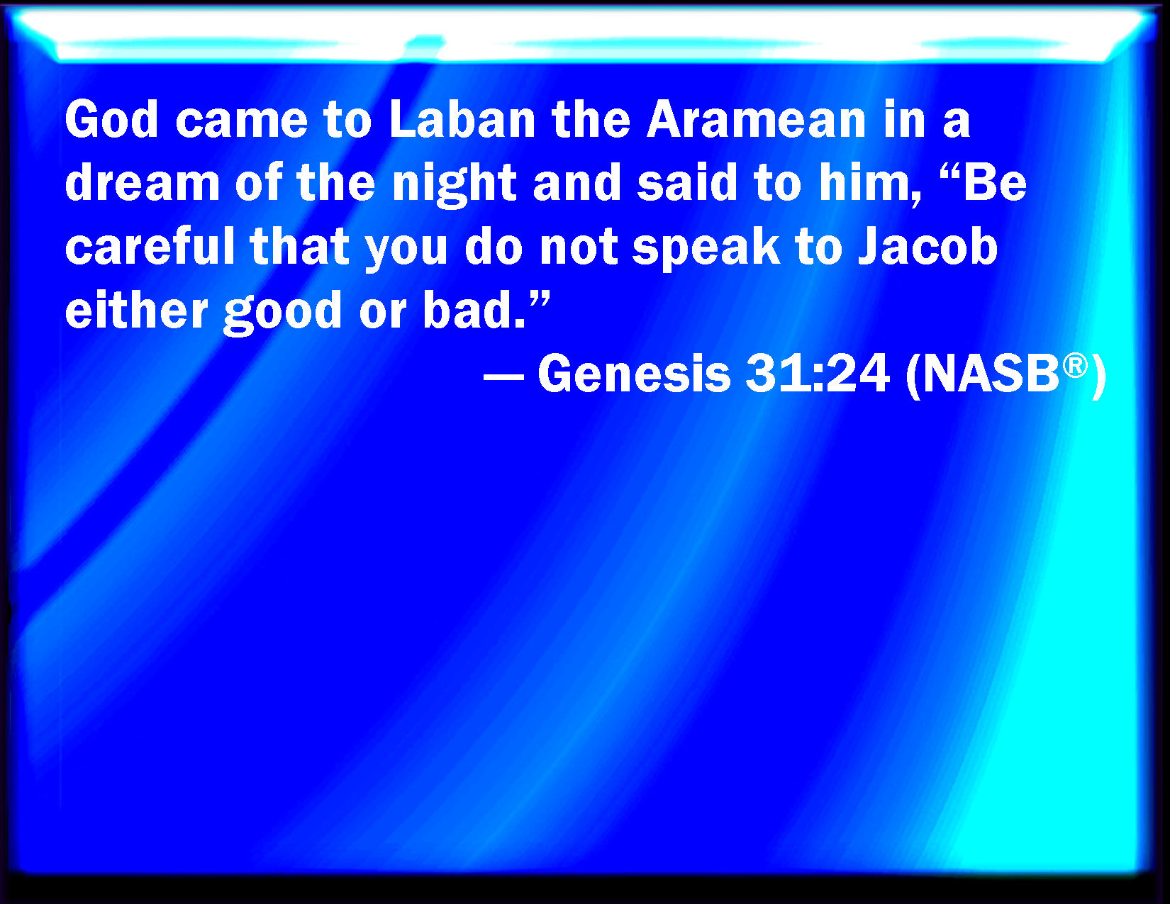 Bible Verse Slide Genesis 31:24 And God came to Laban the Syrian in a dream by night, and said to him, Take heed that you speak not to Jacob either good or bad. KJV: And God came to Laban the Syrian in a dream by night, and said unto him, Take heed that thou speak not to Jacob either good or bad. DRB: And he saw in a dream God saying to him: Take heed thou speak not any thing harshly against Jacob. DBT: And God came to Laban the Syrian in a dream by night, and said to him, Take care thou speak not to Jacob either good or bad. ERV: And God came to Laban the Syrian in a dream of the night, and said unto him, Take heed to thyself that thou speak not to Jacob either good or bad. WBT: And God came to Laban, the Syrian, in a dream by night, and said to him, Take heed that thou speak not to Jacob either good or bad. WEB: God came to Laban, the Syrian, in a dream of the night, and said to him, "Take heed to yourself that you don't speak to Jacob either good or bad." YLT: And God cometh in unto Laban the Aramaean in a dream of the night, and saith to him, 'Take heed to thyself lest thou speak with Jacob from good unto evil.'Links Genesis 31:24 NIV • Genesis 31:24 NLT • Genesis 31:24 ESV • Genesis 31:24 NASB • Genesis 31:24 KJV • Genesis 31:24 Interlinear • Genesis 31:24 Commentaries • Genesis 31:24 Parallel Texts • Genesis 31:24 Bible Apps • Genesis 31:24 Parallel • Bible Hub |