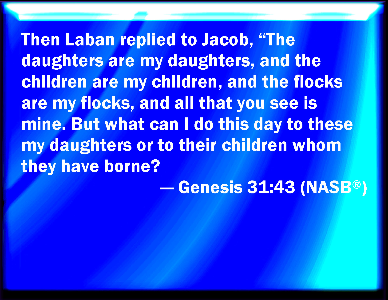 Bible Verse Slide Genesis 31:43 And Laban answered and said to Jacob, These daughters are my daughters, and these children are my children, and these cattle are my cattle, and all that you see is mine: and what can I do this day to these my daughters, or to their children which they have born? KJV: And Laban answered and said unto Jacob, These daughters are my daughters, and these children are my children, and these cattle are my cattle, and all that thou seest is mine: and what can I do this day unto these my daughters, or unto their children which they have born? DRB: Laban answered him: The daughters are mine and the children, and thy flocks, and all things that thou seest are mine: what can I do to my children, and grandchildren? DBT: And Laban answered and said to Jacob, The daughters are my daughters, and the sons are my sons, and the flock is my flock, and all that thou seest is mine; but as for my daughters, what can I do this day to them, or to their sons whom they have brought forth? ERV: And Laban answered and said unto Jacob, The daughters are my daughters, and the children are my children, and the flocks are my flocks, and all that thou seest is mine: and what can I do this day unto these my daughters, or unto their children which they have borne? WBT: And Laban answered, and said to Jacob, These daughters are my daughters, and these children are my children, and these cattle are my cattle, and all that thou seest is mine; and what can I do this day to these my daughters, or to their children which they have borne? WEB: Laban answered Jacob, "The daughters are my daughters, the children are my children, the flocks are my flocks, and all that you see is mine: and what can I do this day to these my daughters, or to their children whom they have borne? YLT: And Laban answereth and saith unto Jacob, 'The daughters are my daughters, and the sons my sons, and the flock my flock, and all that thou art seeing is mine; and to my daughters — what do I to these to-day, or to their sons whom they have born?Links Genesis 31:43 NIV • Genesis 31:43 NLT • Genesis 31:43 ESV • Genesis 31:43 NASB • Genesis 31:43 KJV • Genesis 31:43 Interlinear • Genesis 31:43 Commentaries • Genesis 31:43 Parallel Texts • Genesis 31:43 Bible Apps • Genesis 31:43 Parallel • Bible Hub |