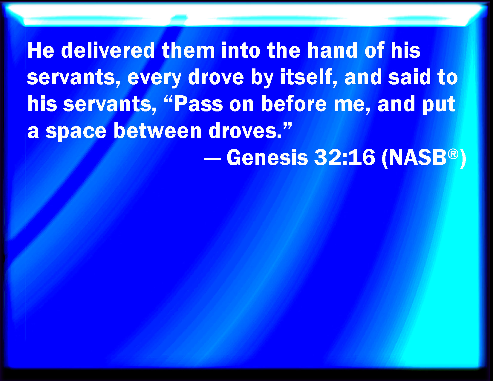 Bible Verse Slide Genesis 32:16 And he delivered them into the hand of his servants, every drove by themselves; and said to his servants, Pass over before me, and put a space between drove and drove. KJV: And he delivered them into the hand of his servants, every drove by themselves; and said unto his servants, Pass over before me, and put a space betwixt drove and drove. DRB: And he sent them by the hands of his servants, every drove by itself, and he said to his servants: Go before me, and let there be a space between drove and drove. DBT: And he delivered them into the hand of his servants, every drove by itself; and he said to his servants, Go on before me, and put a space between drove and drove. ERV: And he delivered them into the hand of his servants, every drove by itself; and said unto his servants, Pass over before me, and put a space betwixt drove and drove. WBT: And he delivered them into the hand of his servants, every drove by themselves; and said to his servants, Pass over before me, and put a space betwixt drove and drove. WEB: He delivered them into the hands of his servants, every herd by itself, and said to his servants, "Pass over before me, and put a space between herd and herd." YLT: and he giveth into the hand of his servants, every drove by itself, and saith unto his servants, 'Pass over before me, and a space ye do put between drove and drove.'Links Genesis 32:16 NIV • Genesis 32:16 NLT • Genesis 32:16 ESV • Genesis 32:16 NASB • Genesis 32:16 KJV • Genesis 32:16 Interlinear • Genesis 32:16 Commentaries • Genesis 32:16 Parallel Texts • Genesis 32:16 Bible Apps • Genesis 32:16 Parallel • Bible Hub |
