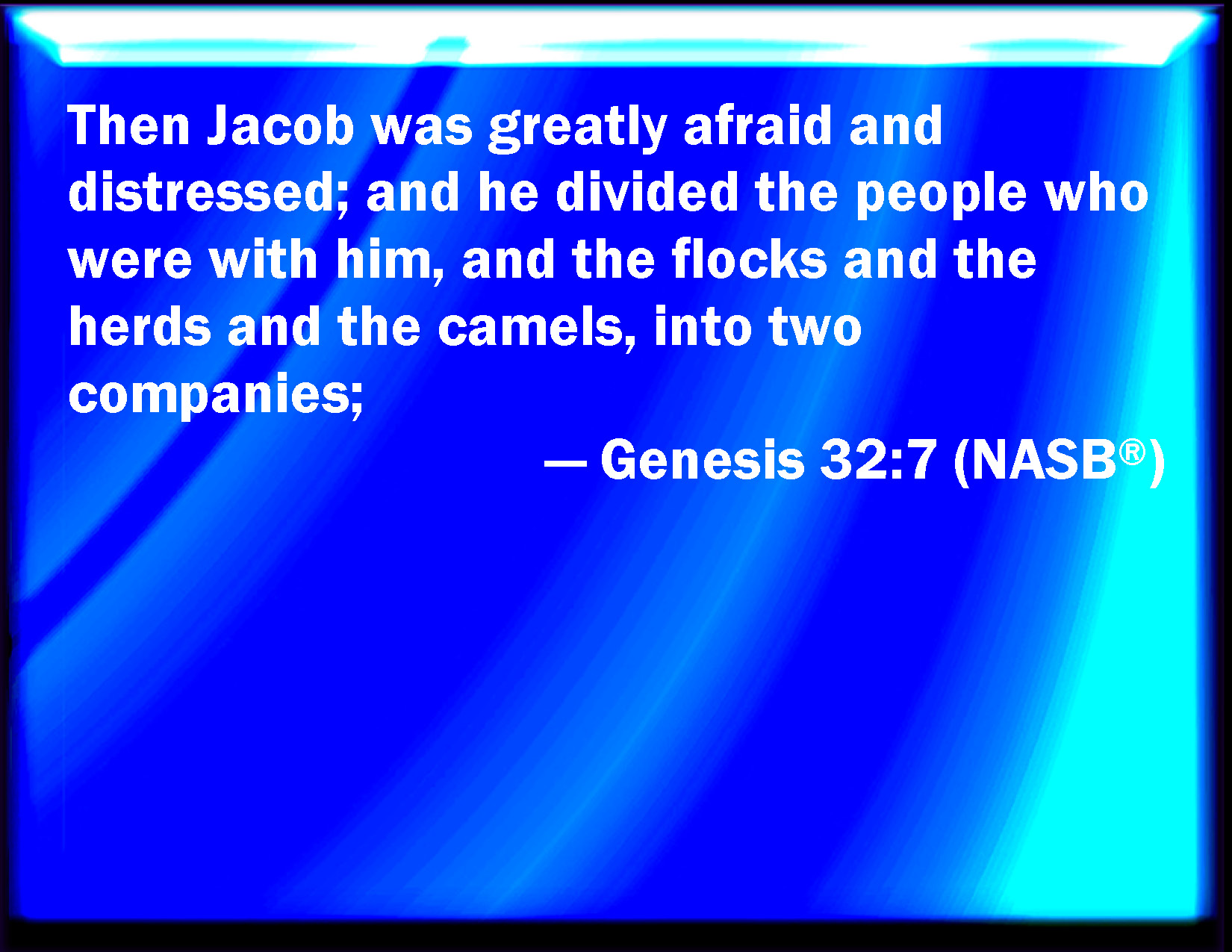Bible Verse Slide Genesis 32:7 Then Jacob was greatly afraid and distressed: and he divided the people that was with him, and the flocks, and herds, and the camels, into two bands; KJV: Then Jacob was greatly afraid and distressed: and he divided the people that was with him, and the flocks, and herds, and the camels, into two bands; DRB: Then Jacob was greatly afraid; and in his fear divided the people that was with him, and the flocks, and the sheep, and the oxen, and the camels, into two companies, DBT: Then Jacob was greatly afraid, and was distressed; and he divided the people that were with him, and the sheep and the cattle and the camels, into two troops. ERV: Then Jacob was greatly afraid and was distressed: and he divided the people that was with him, and the flocks, and the herds, and the camels, into two companies; WBT: Then Jacob was greatly afraid, and distressed: and he divided the people that were with him, and the flocks, and herds, and camels, into two bands; WEB: Then Jacob was greatly afraid and was distressed. He divided the people who were with him, and the flocks, and the herds, and the camels, into two companies; YLT: and Jacob feareth exceedingly, and is distressed, and he divideth the people who are with him, and the flock, and the herd, and the camels, into two camps,Links Genesis 32:7 NIV • Genesis 32:7 NLT • Genesis 32:7 ESV • Genesis 32:7 NASB • Genesis 32:7 KJV • Genesis 32:7 Interlinear • Genesis 32:7 Commentaries • Genesis 32:7 Parallel Texts • Genesis 32:7 Bible Apps • Genesis 32:7 Parallel • Bible Hub |