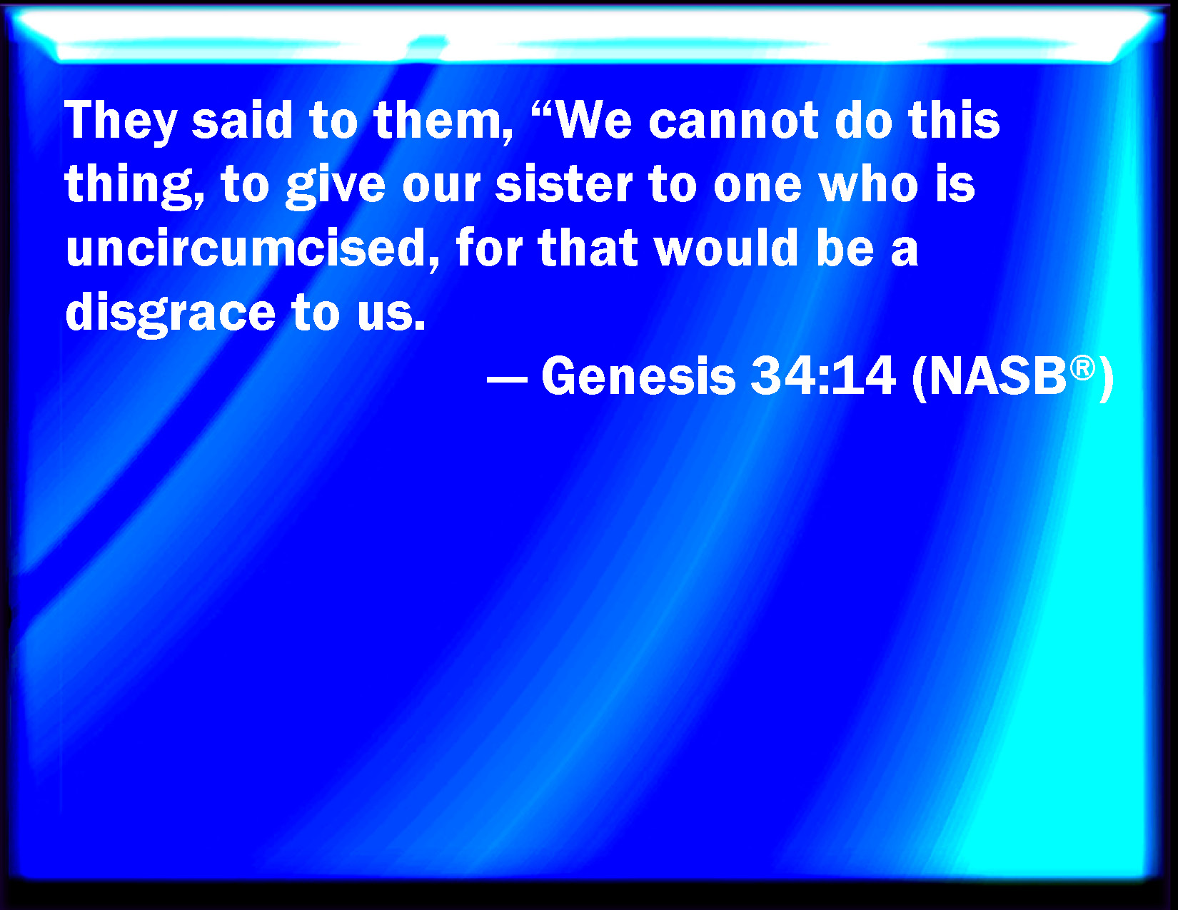Bible Verse Slide Genesis 34:14 And they said to them, We cannot do this thing, to give our sister to one that is uncircumcised; for that were a reproach to us: KJV: And they said unto them, We cannot do this thing, to give our sister to one that is uncircumcised; for that were a reproach unto us: DRB: We cannot do what you demand, nor give our sister to one that is uncircumcised, which with us is unlawful and abominable. DBT: and said to them, We cannot do this, to give our sister to one that is uncircumcised; for that were a reproach to us. ERV: and said unto them, We cannot do this thing, to give our sister to one that is uncircumcised; for that were a reproach unto us: WBT: And they said to them, We cannot do this thing, to give our sister to one that is uncircumcised: for that would be a reproach to us: WEB: and said to them, "We can't do this thing, to give our sister to one who is uncircumcised; for that is a reproach to us. YLT: and say unto them, 'We are not able to do this thing, to give our sister to one who hath a foreskin: for it is a reproach to us.Links Genesis 34:14 NIV • Genesis 34:14 NLT • Genesis 34:14 ESV • Genesis 34:14 NASB • Genesis 34:14 KJV • Genesis 34:14 Interlinear • Genesis 34:14 Commentaries • Genesis 34:14 Parallel Texts • Genesis 34:14 Bible Apps • Genesis 34:14 Parallel • Bible Hub |