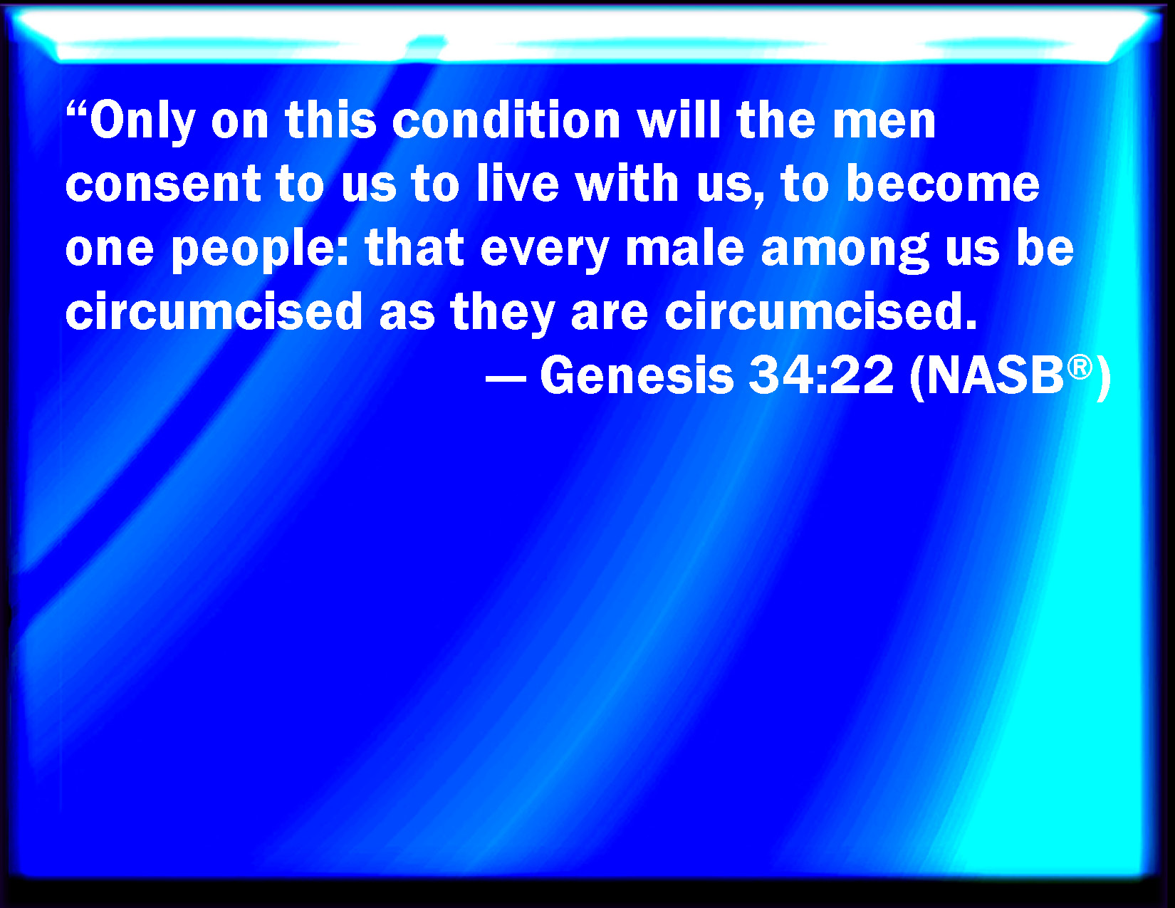 Bible Verse Slide Genesis 34:22 Only herein will the men consent to us for to dwell with us, to be one people, if every male among us be circumcised, as they are circumcised. KJV: Only herein will the men consent unto us for to dwell with us, to be one people, if every male among us be circumcised, as they are circumcised. DRB: One thing there is for which so great a good is deferred: We must circumcise every male among us, following the manner of the nation. DBT: But only in this will the men consent to us to dwell with us, to be one people if every male among us be circumcised, just as they are circumcised. ERV: Only on this condition will the men consent unto us to dwell with us, to become one people, if every male among us be circumcised, as they are circumcised. WBT: Only herein, will the men consent to us to dwell with us, to be one people, if every male among us shall be circumcised, as they are circumcised. WEB: Only on this condition will the men consent to us to live with us, to become one people, if every male among us is circumcised, as they are circumcised. YLT: 'Only for this do the men consent to us, to dwell with us, to become one people, in every male of us being circumcised, as they are circumcised;Links Genesis 34:22 NIV • Genesis 34:22 NLT • Genesis 34:22 ESV • Genesis 34:22 NASB • Genesis 34:22 KJV • Genesis 34:22 Interlinear • Genesis 34:22 Commentaries • Genesis 34:22 Parallel Texts • Genesis 34:22 Bible Apps • Genesis 34:22 Parallel • Bible Hub |