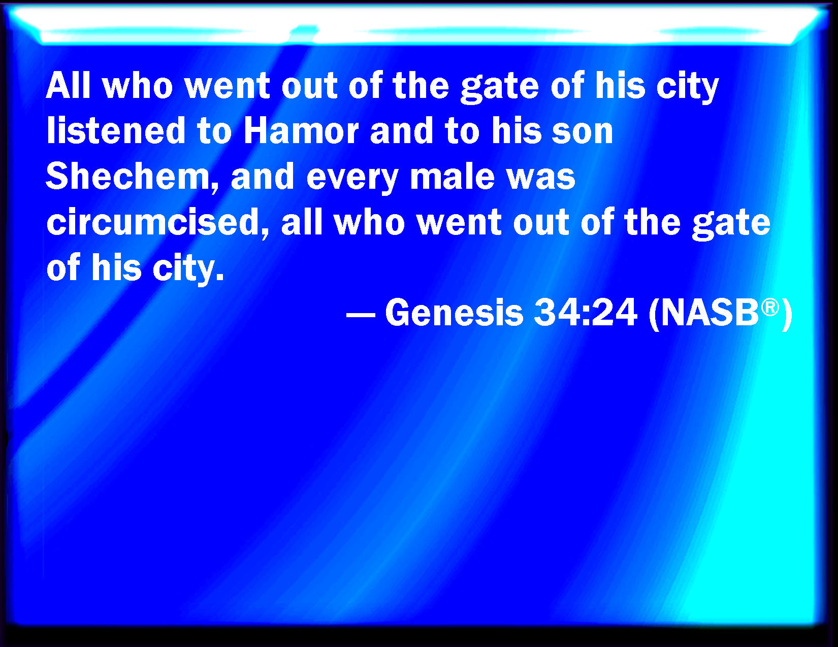 Bible Verse Slide Genesis 34:24 And to Hamor and to Shechem his son listened all that went out of the gate of his city; and every male was circumcised, all that went out of the gate of his city. KJV: And unto Hamor and unto Shechem his son hearkened all that went out of the gate of his city; and every male was circumcised, all that went out of the gate of his city. DRB: And they all agreed, and circumcised all the males. DBT: And all that went out at the gate of his city hearkened to Hamor and to Shechem his son; and every male was circumcised all that went out at the gate of his city. ERV: And unto Hamor and unto Shechem his son hearkened all that went out of the gate of his city; and every male was circumcised, all that went out of the gate of his city. WBT: And to Hamor and to Shechem his son hearkened all that went out of the gate of his city: and every male was circumcised, all that went out of the gate of his city. WEB: All who went out of the gate of his city listened to Hamor, and to Shechem his son; and every male was circumcised, all who went out of the gate of his city. YLT: And unto Hamor, and unto Shechem his son, hearken do all those going out of the gate of his city, and every male is circumcised, all those going out of the gate of his city.Links Genesis 34:24 NIV • Genesis 34:24 NLT • Genesis 34:24 ESV • Genesis 34:24 NASB • Genesis 34:24 KJV • Genesis 34:24 Interlinear • Genesis 34:24 Commentaries • Genesis 34:24 Parallel Texts • Genesis 34:24 Bible Apps • Genesis 34:24 Parallel • Bible Hub |