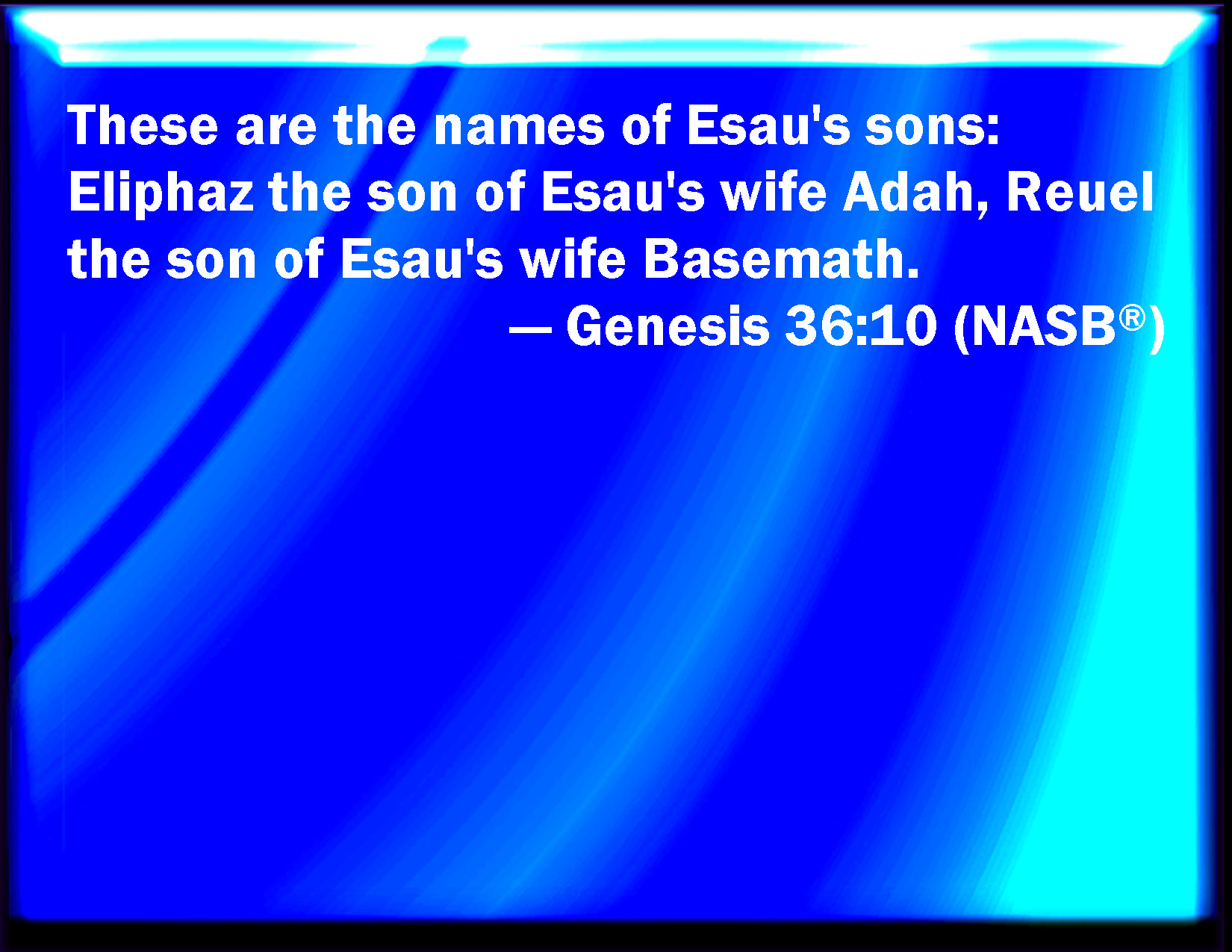 Bible Verse Slide Genesis 36:10 These are the names of Esau's sons; Eliphaz the son of Adah the wife of Esau, Reuel the son of Bashemath the wife of Esau. KJV: These are the names of Esau's sons; Eliphaz the son of Adah the wife of Esau, Reuel the son of Bashemath the wife of Esau. DRB: And these the names of his sons: Eliphaz the son of Ada the wife of Esau: and Rahnel the son of Basemath his wife. DBT: These are the names of Esau's sons: Eliphaz, the son of Adah the wife of Esau; Reuel, the son of Basmath the wife of Esau. ERV: these are the names of Esau's sons; Eliphaz the son of Adah the wife of Esau, Reuel the son of Basemath the wife of Esau. WBT: These are the names of Esau's sons; Eliphaz the son of Adah the wife of Esau, Reuel the son of Bashemath the wife of Esau. WEB: these are the names of Esau's sons: Eliphaz, the son of Adah, the wife of Esau; and Reuel, the son of Basemath, the wife of Esau. YLT: These are the names of the sons of Esau: Eliphaz son of Adah, wife of Esau; Reuel son of Bashemath, wife of Esau.Links Genesis 36:10 NIV • Genesis 36:10 NLT • Genesis 36:10 ESV • Genesis 36:10 NASB • Genesis 36:10 KJV • Genesis 36:10 Interlinear • Genesis 36:10 Commentaries • Genesis 36:10 Parallel Texts • Genesis 36:10 Bible Apps • Genesis 36:10 Parallel • Bible Hub |