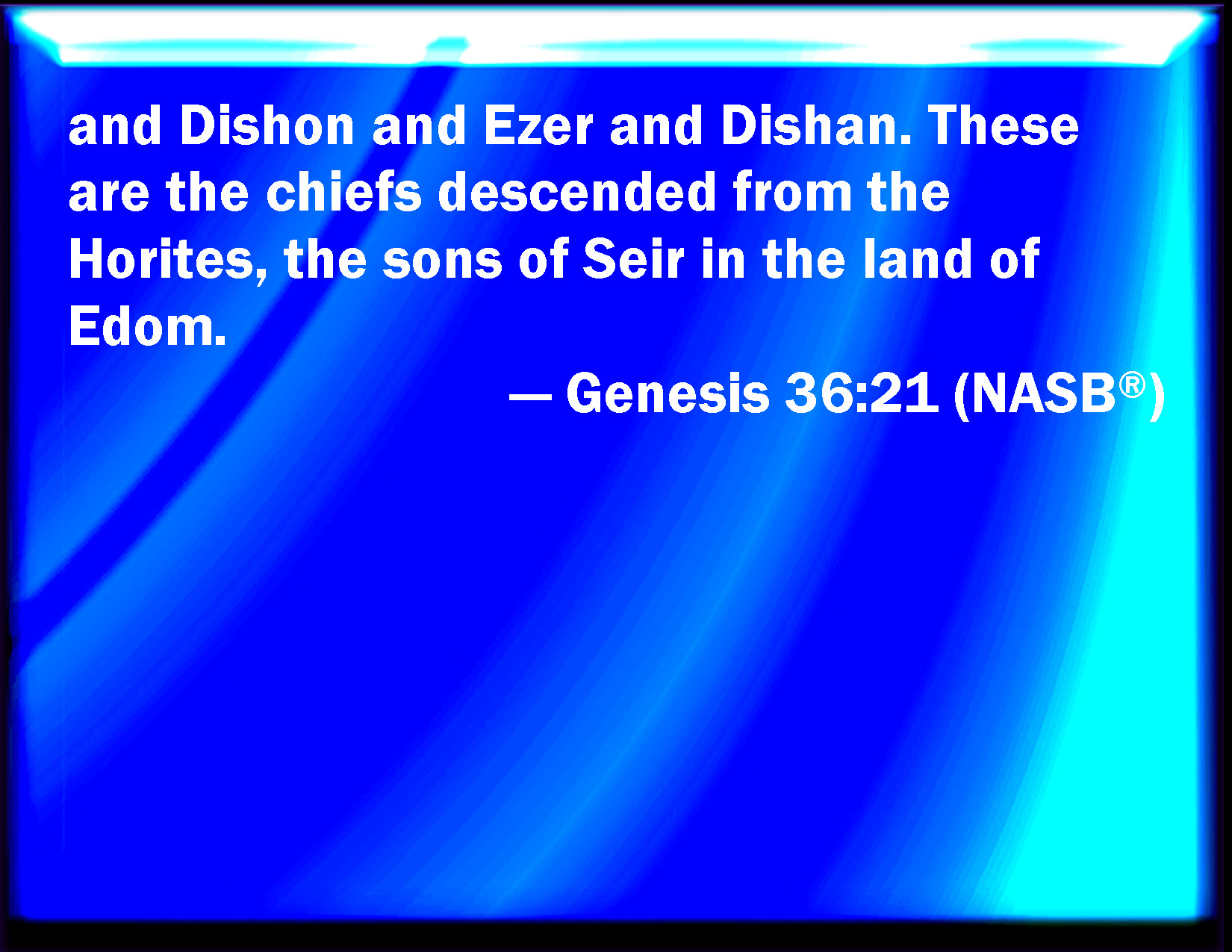 Bible Verse Slide Genesis 36:21 And Dishon, and Ezer, and Dishan: these are the dukes of the Horites, the children of Seir in the land of Edom. KJV: And Dishon, and Ezer, and Dishan: these are the dukes of the Horites, the children of Seir in the land of Edom. DRB: And Dison, and Eser, and Disan. These are dukes of the Horrites, the sons of Seir in the land of Edom. DBT: and Dishon, and Ezer, and Dishan. These are the chiefs of the Horites, the sons of Seir in the land of Edom. ERV: and Dishon and Ezer and Dishan: these are the dukes that came of the Horites, the children of Seir in the land of Edom. WBT: And Dishon, and Ezer, and Dishan: these are the dukes of the Horites, the children of Seir in the land of Edom. WEB: Dishon, Ezer, and Dishan. These are the chiefs who came of the Horites, the children of Seir in the land of Edom. YLT: and Dishon, and Ezer, and Dishan; these are chiefs of the Horites, sons of Seir, in the land of Edom.Links Genesis 36:21 NIV • Genesis 36:21 NLT • Genesis 36:21 ESV • Genesis 36:21 NASB • Genesis 36:21 KJV • Genesis 36:21 Interlinear • Genesis 36:21 Commentaries • Genesis 36:21 Parallel Texts • Genesis 36:21 Bible Apps • Genesis 36:21 Parallel • Bible Hub |
