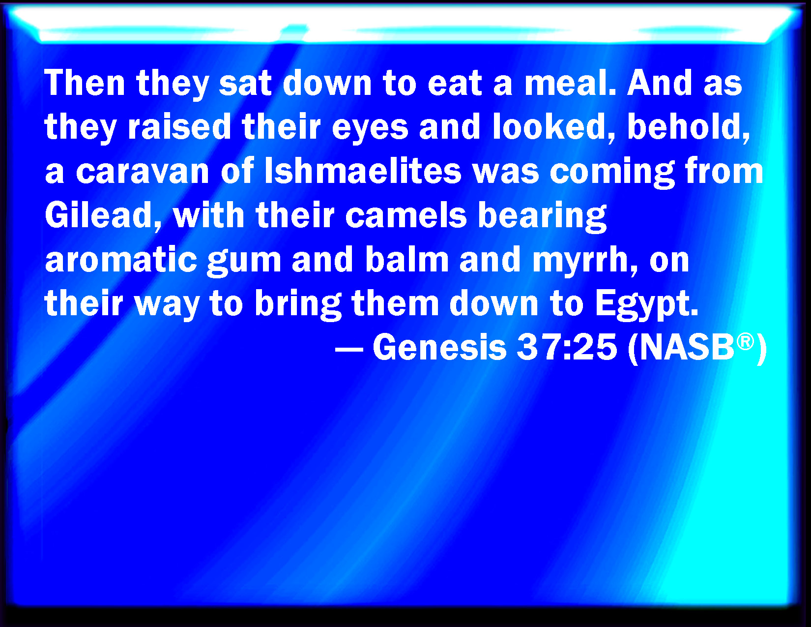 Bible Verse Slide Genesis 37:25 And they sat down to eat bread: and they lifted up their eyes and looked, and, behold, a company of Ishmeelites came from Gilead with their camels bearing spices and balm and myrrh, going to carry it down to Egypt. KJV: And they sat down to eat bread: and they lifted up their eyes and looked, and, behold, a company of Ishmeelites came from Gilead with their camels bearing spicery and balm and myrrh, going to carry it down to Egypt. DRB: And sitting down to eat bread, they saw some Ismaelites on their way coming from Calaad, with their camels, carrying spices, and balm, and myrrh to Egypt. DBT: And they sat down to eat bread; and they lifted up their eyes and looked, and behold, a caravan of Ishmaelites came from Gilead; and their camels bore tragacanth, and balsam, and ladanum going to carry it down to Egypt. ERV: And they sat down to eat bread: and they lifted up their eyes and looked, and, behold, a travelling company of Ishmaelites came from Gilead, with their camels bearing spicery and balm and myrrh, going to carry it down to Egypt. WBT: And they sat down to eat bread: and they lifted up their eyes and looked, and behold, a company of Ishmaelites came from Gilead, with their camels bearing spicery, and balm, and myrrh, going to carry them down to Egypt. WEB: They sat down to eat bread, and they lifted up their eyes and looked, and saw a caravan of Ishmaelites was coming from Gilead, with their camels bearing spices and balm and myrrh, going to carry it down to Egypt. YLT: And they sit down to eat bread, and they lift up their eyes, and look, and lo, a company of Ishmaelites coming from Gilead, and their camels bearing spices, and balm, and myrrh, going to take them down to Egypt.Links Genesis 37:25 NIV • Genesis 37:25 NLT • Genesis 37:25 ESV • Genesis 37:25 NASB • Genesis 37:25 KJV • Genesis 37:25 Interlinear • Genesis 37:25 Commentaries • Genesis 37:25 Parallel Texts • Genesis 37:25 Bible Apps • Genesis 37:25 Parallel • Bible Hub |