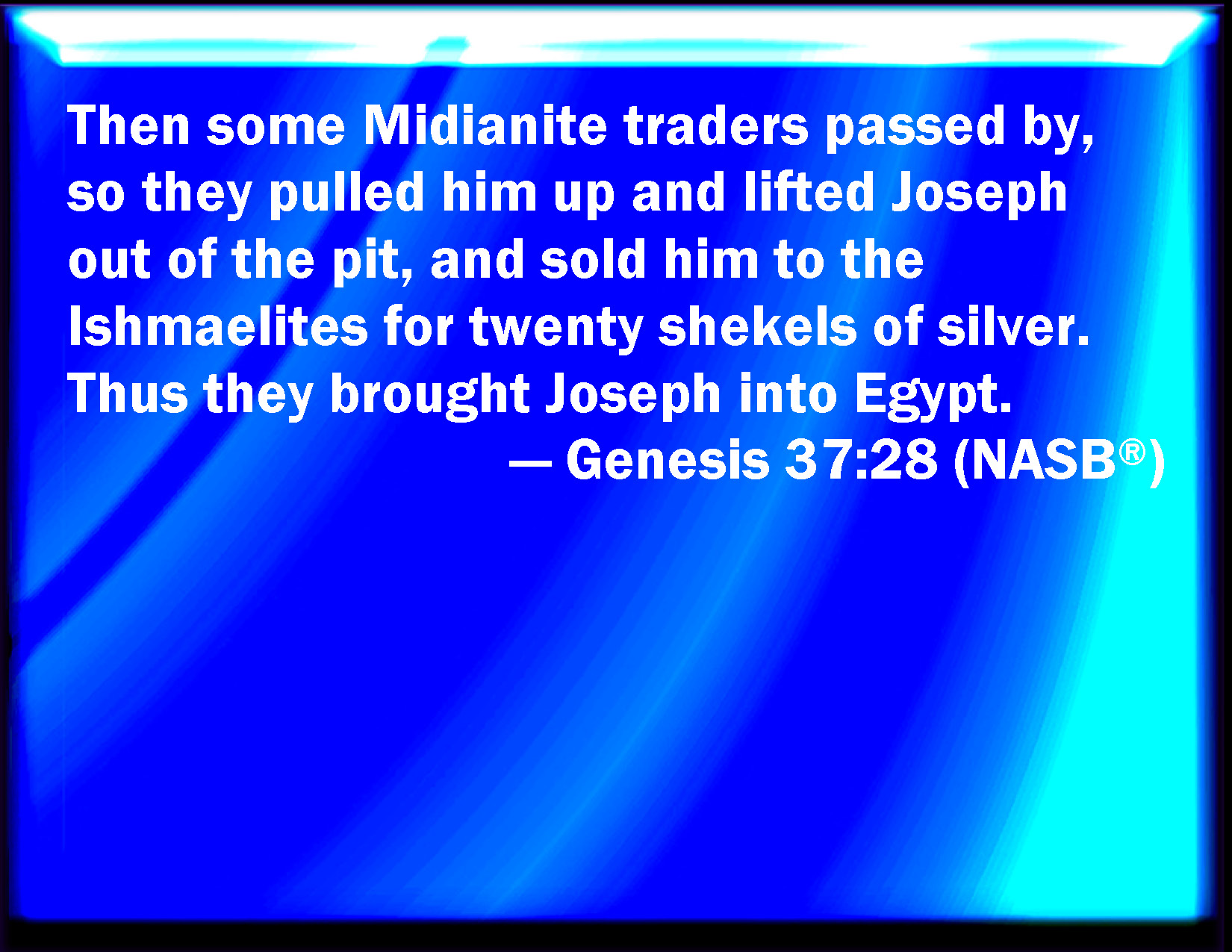 Bible Verse Slide Genesis 37:28 Then there passed by Midianites merchants; and they drew and lifted up Joseph out of the pit, and sold Joseph to the Ishmeelites for twenty pieces of silver: and they brought Joseph into Egypt. KJV: Then there passed by Midianites merchantmen; and they drew and lifted up Joseph out of the pit, and sold Joseph to the Ishmeelites for twenty pieces of silver: and they brought Joseph into Egypt. DRB: And when the Madianite merchants passed by, they drew him out of the pit, and sold him to the Ismaelites, for twenty pieces of silver: and they led him into Egypt. DBT: And Midianitish men, merchants, passed by; and they drew and lifted up Joseph out of the pit, and sold Joseph to the Ishmaelites for twenty silver-pieces; and they brought Joseph to Egypt. ERV: And there passed by Midianites, merchantmen; and they drew and lifted up Joseph out of the pit, and sold Joseph to the Ishmaelites for twenty pieces of silver. And they brought Joseph into Egypt. WBT: Then there passed by Midianites, merchants; and they drew and lifted Joseph out of the pit, and sold Joseph to the Ishmaelites for twenty pieces of silver: and they brought Joseph into Egypt. WEB: Midianites who were merchants passed by, and they drew and lifted up Joseph out of the pit, and sold Joseph to the Ishmaelites for twenty pieces of silver. They brought Joseph into Egypt. YLT: And Midianite merchantmen pass by and they draw out and bring up Joseph out of the pit, and sell Joseph to the Ishmaelites for twenty silverlings, and they bring Joseph into Egypt.Links Genesis 37:28 NIV • Genesis 37:28 NLT • Genesis 37:28 ESV • Genesis 37:28 NASB • Genesis 37:28 KJV • Genesis 37:28 Interlinear • Genesis 37:28 Commentaries • Genesis 37:28 Parallel Texts • Genesis 37:28 Bible Apps • Genesis 37:28 Parallel • Bible Hub |