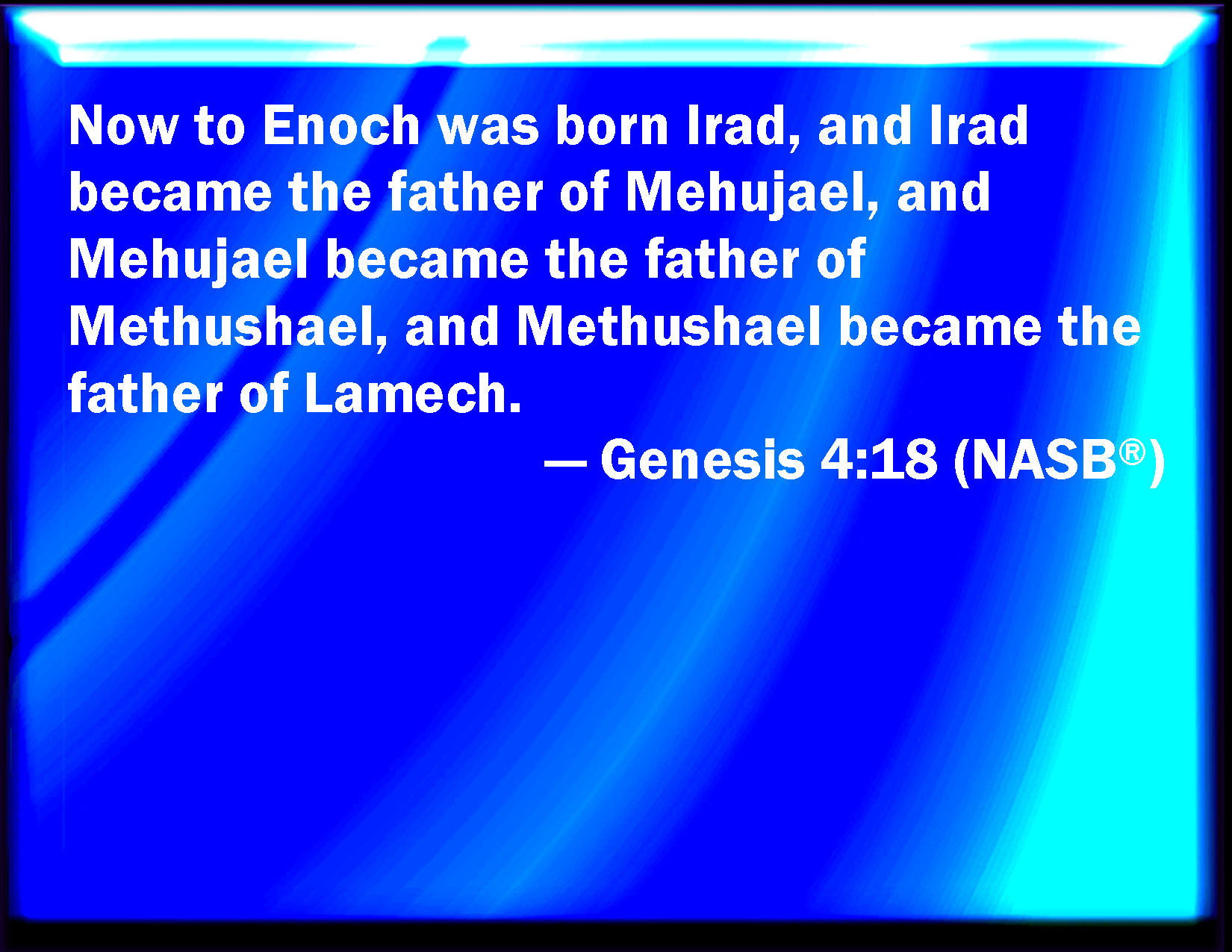 To Enoch was born Irad. Irad became the father of Mehujael. Mehujael became the father of Methushael. Methushael became the father of Lamech.