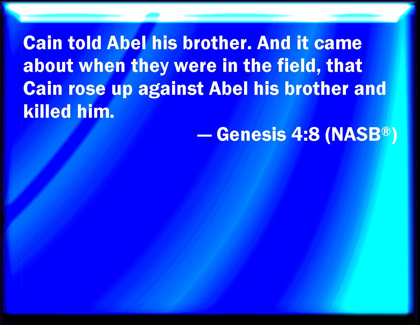 Bible Verse Slide Genesis 4:8 And Cain talked with Abel his brother: and it came to pass, when they were in the field, that Cain rose up against Abel his brother, and slew him. KJV: And Cain talked with Abel his brother: and it came to pass, when they were in the field, that Cain rose up against Abel his brother, and slew him. DRB: And Cain said to Abel his brother: Let us go forth abroad. And when they were in the field, Cain rose up against his brother Abel, and slew him. DBT: And Cain spoke to Abel his brother, and it came to pass when they were in the field, that Cain rose up against Abel his brother, and slew him. ERV: And Cain told Abel his brother. And it came to pass, when they were in the field, that Cain rose up against Abel his brother, and slew him. WBT: And Cain talked with Abel his brother: and it came to pass when they were in the field, that Cain rose up against Abel his brother, and slew him. WEB: Cain said to Abel, his brother, "Let's go into the field." It happened when they were in the field, that Cain rose up against Abel, his brother, and killed him. YLT: And Cain saith unto Abel his brother, 'Let us go into the field;' and it cometh to pass in their being in the field, that Cain riseth up against Abel his brother, and slayeth him.Links Genesis 4:8 NIV • Genesis 4:8 NLT • Genesis 4:8 ESV • Genesis 4:8 NASB • Genesis 4:8 KJV • Genesis 4:8 Interlinear • Genesis 4:8 Commentaries • Genesis 4:8 Parallel Texts • Genesis 4:8 Bible Apps • Genesis 4:8 Parallel • Bible Hub |