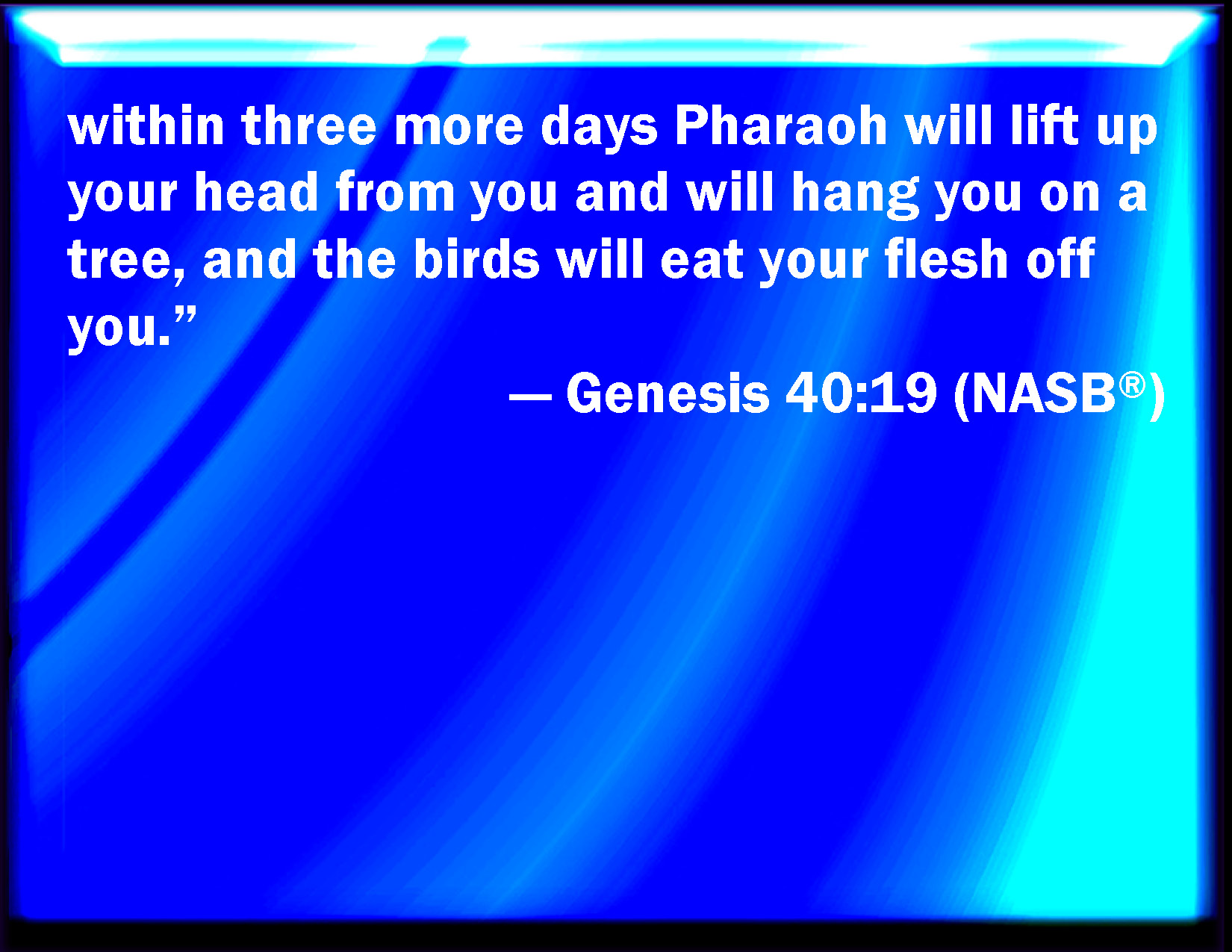 Bible Verse Slide Genesis 40:19 Yet within three days shall Pharaoh lift up your head from off you, and shall hang you on a tree; and the birds shall eat your flesh from off you. KJV: Yet within three days shall Pharaoh lift up thy head from off thee, and shall hang thee on a tree; and the birds shall eat thy flesh from off thee. DRB: After which Pharao will take thy hand from thee, and hang thee on a cross, and the birds shall tear thy flesh. DBT: In yet three days will Pharaoh lift up thy head from off thee, and hang thee on a tree; and the birds will eat thy flesh from off thee. ERV: within yet three days shall Pharaoh lift up thy head from off thee, and shall hang thee on a tree; and the birds shall eat thy flesh from off thee. WBT: Yet within three days shall Pharaoh lift up thy head from off thee, and shall hang thee on a tree; and the birds shall eat thy flesh from off thee. WEB: Within three more days, Pharaoh will lift up your head from off you, and will hang you on a tree; and the birds will eat your flesh from off you." YLT: yet, within three days doth Pharaoh lift up thy head from off thee, and hath hanged thee on a tree, and the birds have eaten thy flesh from off thee.'Links Genesis 40:19 NIV • Genesis 40:19 NLT • Genesis 40:19 ESV • Genesis 40:19 NASB • Genesis 40:19 KJV • Genesis 40:19 Interlinear • Genesis 40:19 Commentaries • Genesis 40:19 Parallel Texts • Genesis 40:19 Bible Apps • Genesis 40:19 Parallel • Bible Hub |