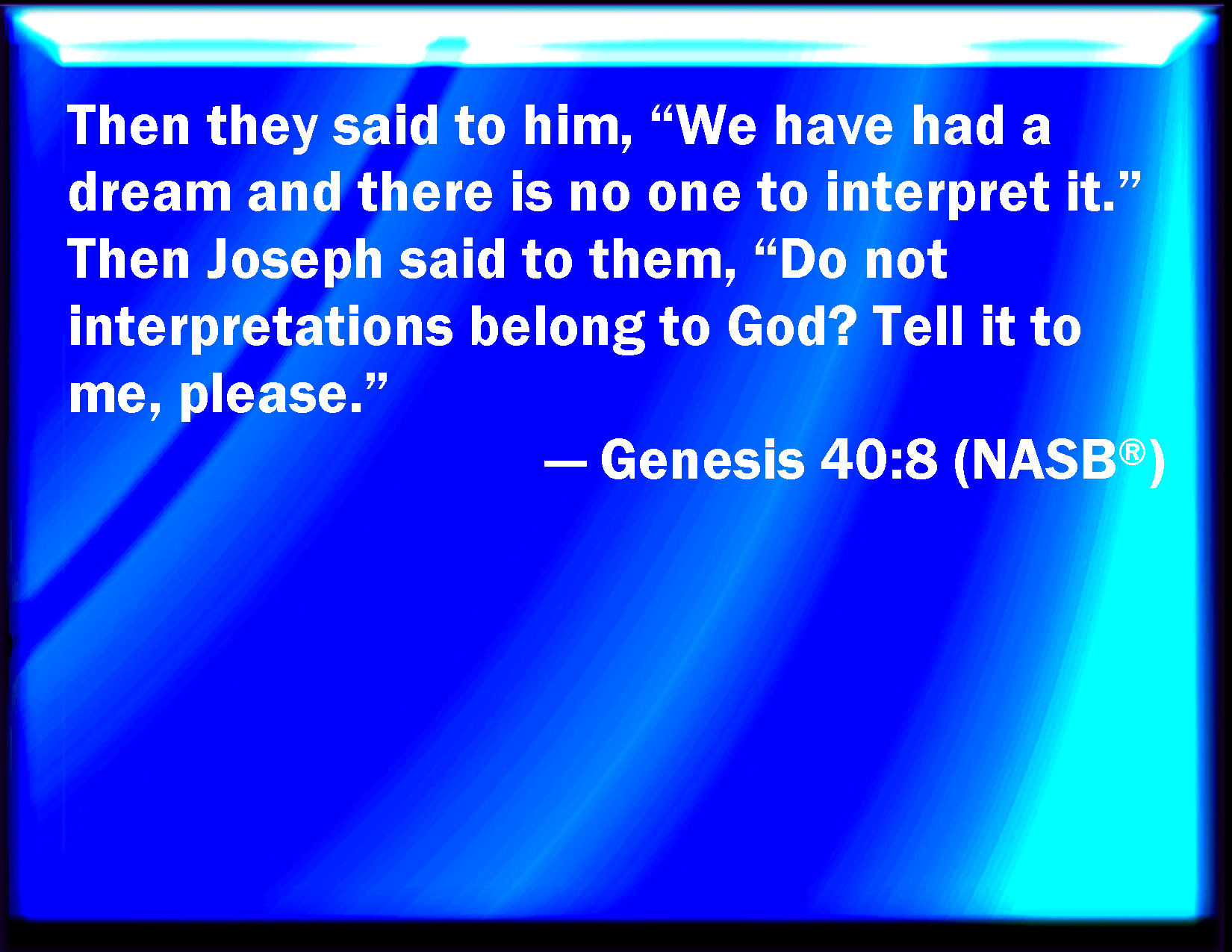 Bible Verse Slide Genesis 40:8 And they said to him, We have dreamed a dream, and there is no interpreter of it. And Joseph said to them, Do not interpretations belong to God? tell me them, I pray you. KJV: And they said unto him, We have dreamed a dream, and there is no interpreter of it. And Joseph said unto them, Do not interpretations belong to God? tell me them, I pray you. DRB: They answered: We have dreamed a dream, and there is nobody to interpret it to us. And Joseph said to them: Both not interpretation belong to God? Tell me what you have dreamed. DBT: And they said to him, We have dreamt a dream, and there is no interpreter of it. And Joseph said to them, Do not interpretations belong to God? tell me your dreams, I pray you. ERV: And they said unto him, We have dreamed a dream, and there is none that can interpret it. And Joseph said unto them, Do not interpretations belong to God? tell it me, I pray you. WBT: And they said to him, We have dreamed a dream, and there is no interpreter of it. And Joseph said to them, Do not interpretations belong to God? tell me them, I pray you. WEB: They said to him, "We have dreamed a dream, and there is no one who can interpret it." Joseph said to them, "Don't interpretations belong to God? Please tell it to me." YLT: And they say unto him, 'A dream we have dreamed, and there is no interpreter of it;' and Joseph saith unto them, 'Are not interpretations with God? recount, I pray you, to me.'Links Genesis 40:8 NIV • Genesis 40:8 NLT • Genesis 40:8 ESV • Genesis 40:8 NASB • Genesis 40:8 KJV • Genesis 40:8 Interlinear • Genesis 40:8 Commentaries • Genesis 40:8 Parallel Texts • Genesis 40:8 Bible Apps • Genesis 40:8 Parallel • Bible Hub |
