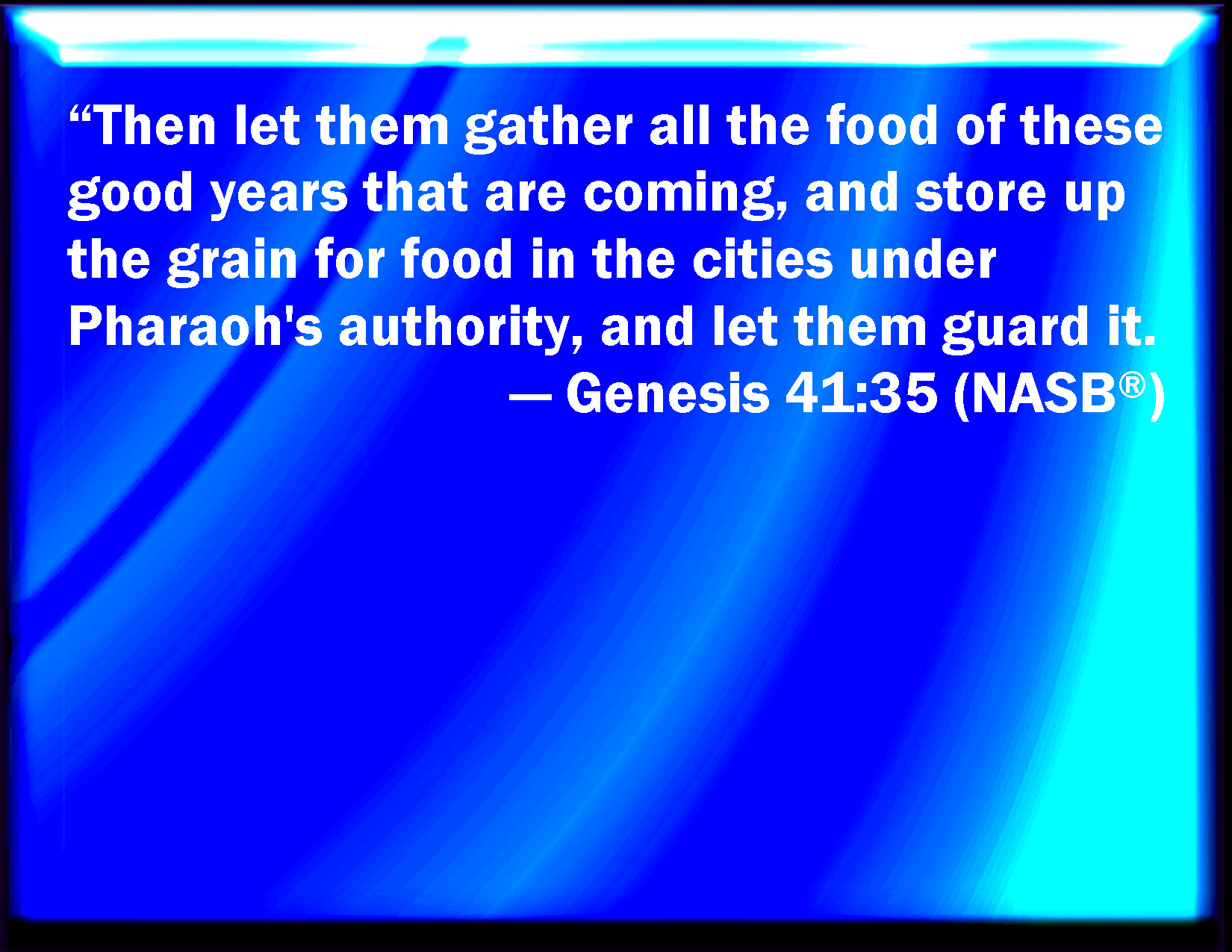 Bible Verse Slide Genesis 41:35 And let them gather all the food of those good years that come, and lay up corn under the hand of Pharaoh, and let them keep food in the cities. KJV: And let them gather all the food of those good years that come, and lay up corn under the hand of Pharaoh, and let them keep food in the cities. DRB: That shall now presently ensue: and let all the corn be laid up under Pharao's hands and be reserved in the cities. DBT: and let them gather all the food of these coming good years, and lay up corn under the hand of Pharaoh, for food in the cities, and keep it. ERV: And let them gather all the food of these good years that come, and lay up corn under the hand of Pharaoh for food in the cities, and let them keep it. WBT: And let them gather all the food of those good years that come, and lay up corn under the hand of Pharaoh; and let them keep food in the cities. WEB: Let them gather all the food of these good years that come, and lay up grain under the hand of Pharaoh for food in the cities, and let them keep it. YLT: and they gather all the food of these good years that are coming, and heap up corn under the hand of Pharaoh — food in the cities; and they have kept it,Links Genesis 41:35 NIV • Genesis 41:35 NLT • Genesis 41:35 ESV • Genesis 41:35 NASB • Genesis 41:35 KJV • Genesis 41:35 Interlinear • Genesis 41:35 Commentaries • Genesis 41:35 Parallel Texts • Genesis 41:35 Bible Apps • Genesis 41:35 Parallel • Bible Hub |