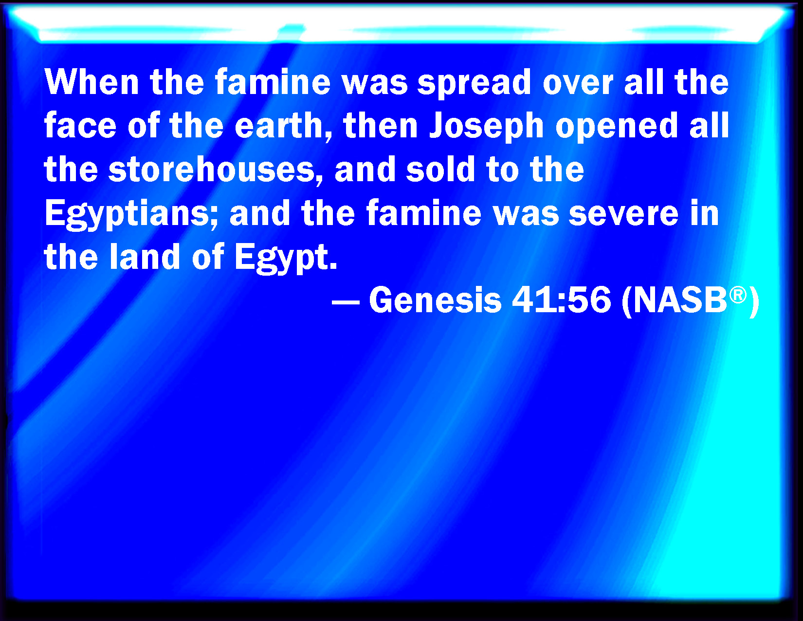 Bible Verse Slide Genesis 41:56 And the famine was over all the face of the earth: and Joseph opened all the storehouses, and sold to the Egyptians; and the famine waxed sore in the land of Egypt. KJV: And the famine was over all the face of the earth: And Joseph opened all the storehouses, and sold unto the Egyptians; and the famine waxed sore in the land of Egypt. DRB: And the famine increased daily in all the land: and Joseph opened all the barns, and sold to the Egyptians: for the famine had oppressed them also. DBT: And the famine was on all the earth. And Joseph opened every place in which there was provision, and sold grain to the Egyptians; and the famine was grievous in the land of Egypt. ERV: And the famine was over all the face of the earth: and Joseph opened all the storehouses, and sold unto the Egyptians; and the famine was sore in the land of Egypt. WBT: And the famine was over all the face of the earth; and Joseph opened all the store-houses, and sold to the Egyptians; and the famine became severe in the land of Egypt. WEB: The famine was over all the surface of the earth. Joseph opened all the store houses, and sold to the Egyptians. The famine was severe in the land of Egypt. YLT: And the famine has been over all the face of the land, and Joseph openeth all places which have corn in them, and selleth to the Egyptians; and the famine is severe in the land of Egypt,Links Genesis 41:56 NIV • Genesis 41:56 NLT • Genesis 41:56 ESV • Genesis 41:56 NASB • Genesis 41:56 KJV • Genesis 41:56 Interlinear • Genesis 41:56 Commentaries • Genesis 41:56 Parallel Texts • Genesis 41:56 Bible Apps • Genesis 41:56 Parallel • Bible Hub |