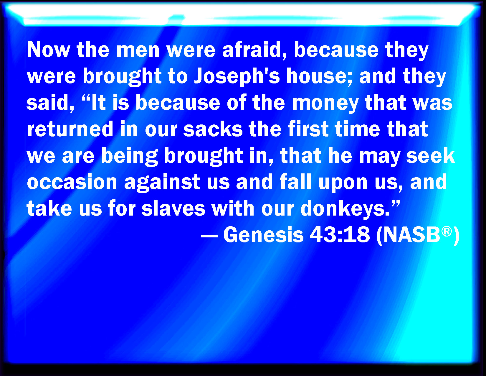 Bible Verse Slide Genesis 43:18 And the men were afraid, because they were brought into Joseph's house; and they said, Because of the money that was returned in our sacks at the first time are we brought in; that he may seek occasion against us, and fall on us, and take us for slaves, and our asses. KJV: And the men were afraid, because they were brought into Joseph's house; and they said, Because of the money that was returned in our sacks at the first time are we brought in; that he may seek occasion against us, and fall upon us, and take us for bondmen, and our asses. DRB: And they being much afraid, said there one to another: Because of the money, which we carried back the first time in our sacks, we are brought in: that he may bring upon us a false accusation, and by violence make slaves of us and our asses. DBT: And the men were afraid because they were brought into Joseph's house, and said, Because of the money that was returned to us in our sacks at the beginning are we brought in, that he may turn against us, and fall upon us and take us for bondmen, and our asses. ERV: And the men were afraid, because they were brought into Joseph's house; and they said, Because of the money that was returned in our sacks at the first time are we brought in; that he may seek occasion against us, and fall upon us, and take us for bondmen, and our asses. WBT: And the men were afraid, because they were brought into Joseph's house; and they said, Because of the money that was returned in our sacks at the first time, are we brought in; that he may seek occasion against us, and fall upon us, and take us for bond-men, and our asses. WEB: The men were afraid, because they were brought to Joseph's house; and they said, "Because of the money that was returned in our sacks at the first time, we're brought in; that he may seek occasion against us, attack us, and seize us as slaves, along with our donkeys." YLT: and the men are afraid because they have been brought into the house of Joseph, and they say, 'For the matter of the money which was put back in our bags at the commencement are we brought in — to roll himself upon us, and to throw himself on us, and to take us for servants — our asses also.'Links Genesis 43:18 NIV • Genesis 43:18 NLT • Genesis 43:18 ESV • Genesis 43:18 NASB • Genesis 43:18 KJV • Genesis 43:18 Interlinear • Genesis 43:18 Commentaries • Genesis 43:18 Parallel Texts • Genesis 43:18 Bible Apps • Genesis 43:18 Parallel • Bible Hub |