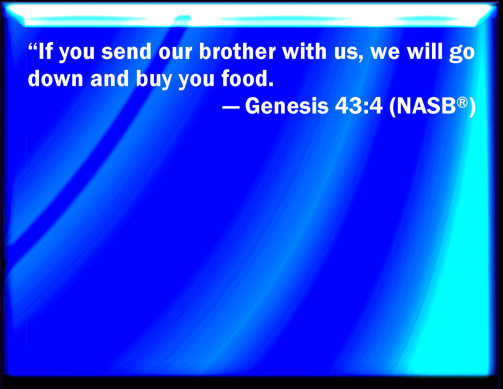 Bible Verse Slide Genesis 43:4 If you will send our brother with us, we will go down and buy you food: KJV: If thou wilt send our brother with us, we will go down and buy thee food: DRB: If therefore thou wilt send him with us, we will set out together, and will buy necessaries for thee. DBT: If thou wilt send our brother with us, we will go down and buy thee food; ERV: If thou wilt send our brother with us, we will go down and buy thee food: WBT: If thou wilt send our brother with us, we will go down and buy thee food: WEB: If you'll send our brother with us, we'll go down and buy you food, YLT: if thou art sending our brother with us, we go down, and buy for thee food,Links Genesis 43:4 NIV • Genesis 43:4 NLT • Genesis 43:4 ESV • Genesis 43:4 NASB • Genesis 43:4 KJV • Genesis 43:4 Interlinear • Genesis 43:4 Commentaries • Genesis 43:4 Parallel Texts • Genesis 43:4 Bible Apps • Genesis 43:4 Parallel • Bible Hub |