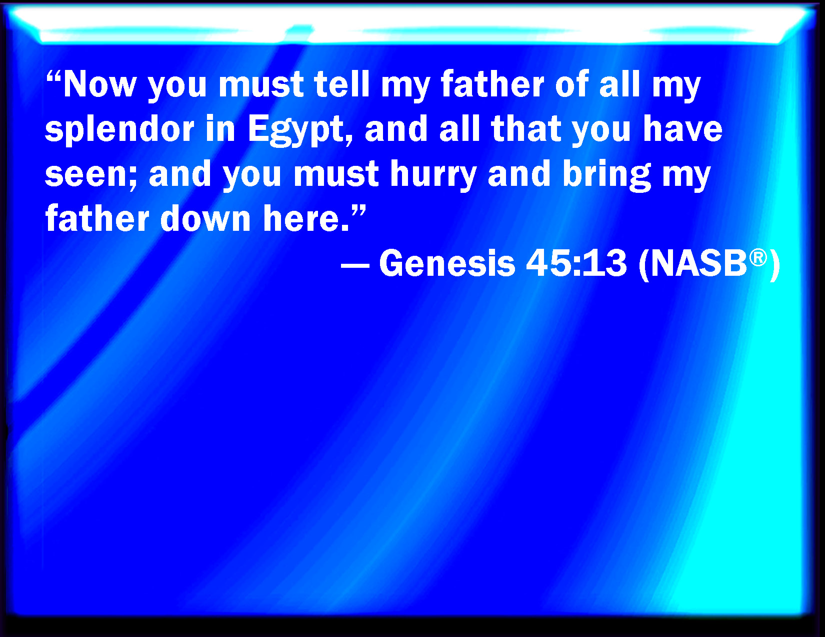 Bible Verse Slide Genesis 45:13 And you shall tell my father of all my glory in Egypt, and of all that you have seen; and you shall haste and bring down my father here. KJV: And ye shall tell my father of all my glory in Egypt, and of all that ye have seen; and ye shall haste and bring down my father hither. DRB: You shall tell my father of all my glory, and all things that you have seen in Egypt: make haste and bring him to me. DBT: And tell my father of all my glory in Egypt, and of all that ye have seen, and haste and bring down my father hither. ERV: And ye shall tell my father of all my glory in Egypt, and of all that ye have seen; and ye shall haste and bring down my father hither. WBT: And ye shall tell my father of all my glory in Egypt, and of all that ye have seen: and ye shall haste, and bring down my father hither. WEB: You shall tell my father of all my glory in Egypt, and of all that you have seen. You shall hurry and bring my father down here." YLT: and ye have declared to my father all my honour in Egypt, and all that ye have seen, and ye have hasted, and have brought down my father hither.'Links Genesis 45:13 NIV • Genesis 45:13 NLT • Genesis 45:13 ESV • Genesis 45:13 NASB • Genesis 45:13 KJV • Genesis 45:13 Interlinear • Genesis 45:13 Commentaries • Genesis 45:13 Parallel Texts • Genesis 45:13 Bible Apps • Genesis 45:13 Parallel • Bible Hub |