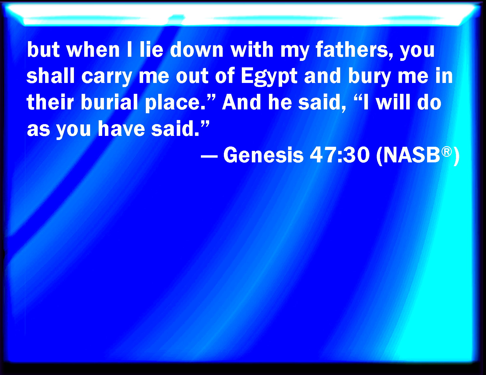 Bible Verse Slide Genesis 47:30 But I will lie with my fathers, and you shall carry me out of Egypt, and bury me in their burial plot. And he said, I will do as you have said. KJV: But I will lie with my fathers, and thou shalt carry me out of Egypt, and bury me in their buryingplace. And he said, I will do as thou hast said. DRB: But I will sleep with my fathers, end thou shalt take me away out of this land, and bury me in the burying place of my ancestors. And Joseph answered him: I will do what thou hast commanded. DBT: but when I shall lie with my fathers, thou shalt carry me out of Egypt, and bury me in their sepulchre. And he said, I will do according to thy word. ERV: but when I sleep with my fathers, thou shalt carry me out of Egypt, and bury me in their buryingplace. And he said, I will do as thou hast said. WBT: But I will lie with my fathers, and thou shalt carry me out of Egypt, and bury me in their burying-place. And he said, I will do as thou hast said. WEB: but when I sleep with my fathers, you shall carry me out of Egypt, and bury me in their burying place." He said, "I will do as you have said." YLT: and I have lain with my fathers, and thou hast borne me out of Egypt, and buried me in their burying-place.' And he saith, 'I — I do according to thy word;'Links Genesis 47:30 NIV • Genesis 47:30 NLT • Genesis 47:30 ESV • Genesis 47:30 NASB • Genesis 47:30 KJV • Genesis 47:30 Interlinear • Genesis 47:30 Commentaries • Genesis 47:30 Parallel Texts • Genesis 47:30 Bible Apps • Genesis 47:30 Parallel • Bible Hub |