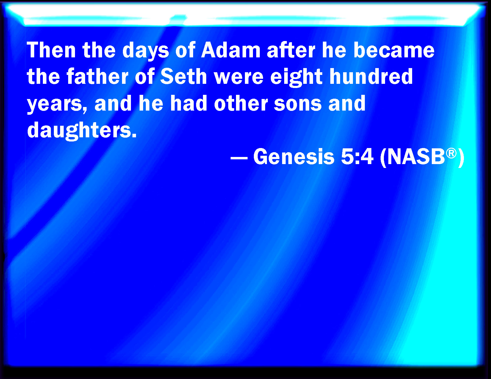 Genesis 5:4 And the days of Adam after he had begotten Seth were eight hundred years: and he begat sons and daughters: