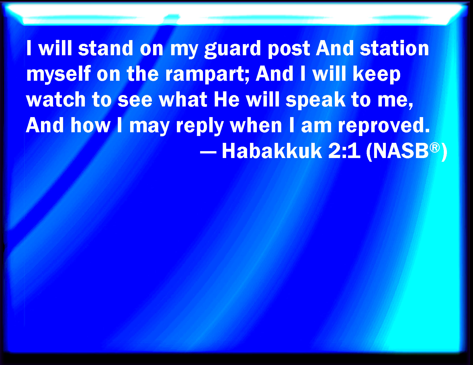 Bible Verse Slide Habakkuk 2:1 I will stand on my watch, and set me on the tower, and will watch to see what he will say to me, and what I shall answer when I am reproved. KJV: I will stand upon my watch, and set me upon the tower, and will watch to see what he will say unto me, and what I shall answer when I am reproved. DRB: I will stand upon my watch, and fix my foot upon the tower: and I will watch, to see what will be said to me, and what I may answer to him that reproveth me. DBT: I will stand upon my watch, and set me upon the tower, and will look forth to see what he will say unto me, and what I shall answer as to my reproof. ERV: I WILL stand upon my watch, and set me upon the tower, and will look forth to see what he will speak with me, and what I shall answer concerning my complaint. WBT: I will stand upon my watch, and seat myself upon the tower, and will watch to see what he will say to me, and what I shall answer when I am reproved. WEB: I will stand at my watch, and set myself on the ramparts, and will look out to see what he will say to me, and what I will answer concerning my complaint. YLT: On my charge I stand, and I station myself on a bulwark, and I watch to see what He doth speak against me, and what I do reply to my reproof.Links Habakkuk 2:1 NIV • Habakkuk 2:1 NLT • Habakkuk 2:1 ESV • Habakkuk 2:1 NASB • Habakkuk 2:1 KJV • Habakkuk 2:1 Interlinear • Habakkuk 2:1 Commentaries • Habakkuk 2:1 Parallel Texts • Habakkuk 2:1 Bible Apps • Habakkuk 2:1 Parallel • Bible Hub |
