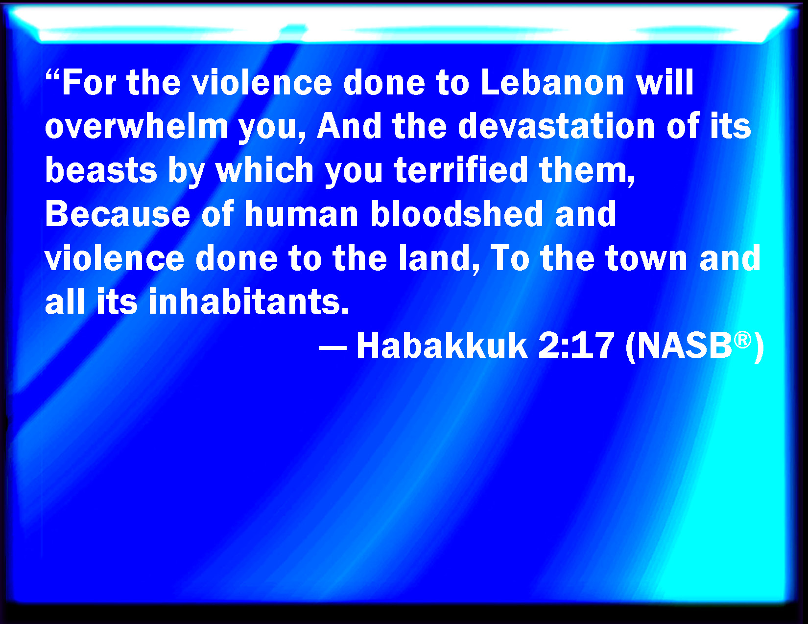 Bible Verse Slide Habakkuk 2:17 For the violence of Lebanon shall cover you, and the spoil of beasts, which made them afraid, because of men's blood, and for the violence of the land, of the city, and of all that dwell therein. KJV: For the violence of Lebanon shall cover thee, and the spoil of beasts, which made them afraid, because of men's blood, and for the violence of the land, of the city, and of all that dwell therein. DRB: For the iniquity of Libanus shall cover thee, and the ravaging of beasts shall terrify them because of the blood of men, and the iniquity of the land, and of the city, and of all that dwell therein. DBT: For the violence done to Lebanon shall cover thee, and the destruction of beasts which made them afraid; because of men's blood, and for the violence done to the land, to the city, and all that dwell therein. ERV: For the violence done to Lebanon shall cover thee, and the destruction of the beasts, which made them afraid; because of men's blood, and for the violence done to the land, to the city and to all that dwell therein. WBT: For the violence of Lebanon shall cover thee, and the spoil of beasts, which made them afraid, because of men's blood, and for the violence of the land, of the city, and of all that dwell therein. WEB: For the violence done to Lebanon will overwhelm you, and the destruction of the animals, which made them afraid; because of men's blood, and for the violence done to the land, to every city and to those who dwell in them. YLT: For violence to Lebanon doth cover thee, And spoil of beasts doth affright them, Because of man's blood, and of violence to the land, To the city, and to all dwelling in it.Links Habakkuk 2:17 NIV • Habakkuk 2:17 NLT • Habakkuk 2:17 ESV • Habakkuk 2:17 NASB • Habakkuk 2:17 KJV • Habakkuk 2:17 Interlinear • Habakkuk 2:17 Commentaries • Habakkuk 2:17 Parallel Texts • Habakkuk 2:17 Bible Apps • Habakkuk 2:17 Parallel • Bible Hub |