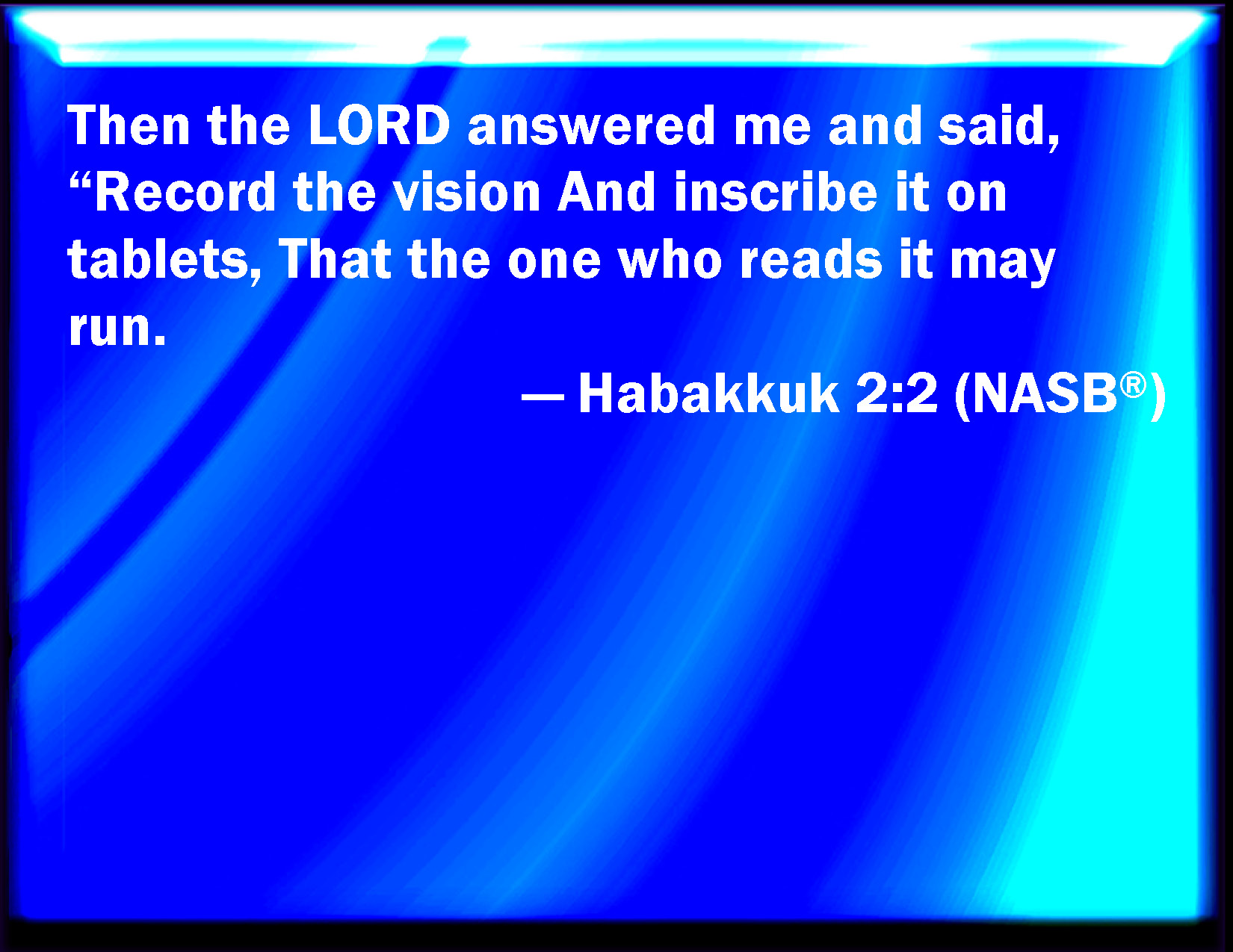 Bible Verse Slide Habakkuk 2:2 And the LORD answered me, and said, Write the vision, and make it plain on tables, that he may run that reads it. KJV: And the LORD answered me, and said, Write the vision, and make it plain upon tables, that he may run that readeth it. DRB: And the Lord answered me, and said: Write the vision, and make it plain upon tables: that he that readeth it may run over it. DBT: And Jehovah answered me and said, Write the vision, and engrave it upon tablets, that he may run that readeth it. ERV: And the LORD answered me, and said, Write the vision, and make it plain upon tables, that he may run that readeth it. WBT: And the LORD answered me, and said, Write the vision, and make it plain upon tables, that he may run that readeth it. WEB: Yahweh answered me, "Write the vision, and make it plain on tablets, that he who runs may read it. YLT: And Jehovah answereth me and saith: 'Write a vision, and explain on the tables, That he may run who is reading it.Links Habakkuk 2:2 NIV • Habakkuk 2:2 NLT • Habakkuk 2:2 ESV • Habakkuk 2:2 NASB • Habakkuk 2:2 KJV • Habakkuk 2:2 Interlinear • Habakkuk 2:2 Commentaries • Habakkuk 2:2 Parallel Texts • Habakkuk 2:2 Bible Apps • Habakkuk 2:2 Parallel • Bible Hub |