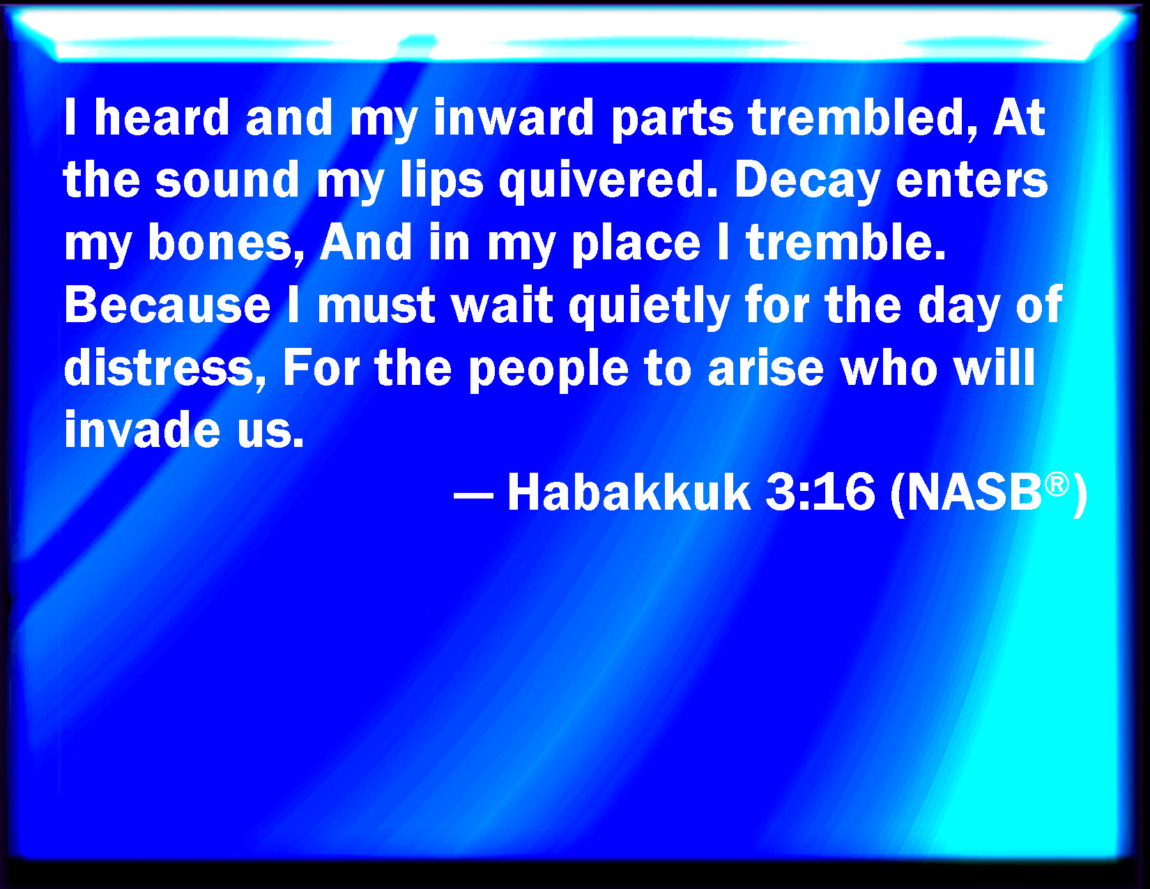 Bible Verse Slide Habakkuk 3:16 When I heard, my belly trembled; my lips quivered at the voice: rottenness entered into my bones, and I trembled in myself, that I might rest in the day of trouble: when he comes up to the people, he will invade them with his troops. KJV: When I heard, my belly trembled; my lips quivered at the voice: rottenness entered into my bones, and I trembled in myself, that I might rest in the day of trouble: when he cometh up unto the people, he will invade them with his troops. DRB: I have heard and my bowels were troubled: my lips trembled at the voice. Let rottenness enter into my bones, and swarm under me. That I may rest in the day of tribulation: that I may go up to our people that are girded. DBT: I heard, and my belly trembled; My lips quivered at the voice; Rottenness entered into my bones, and I trembled in my place, That I might rest in the day of distress, When their invader shall come up against the people. ERV: I heard, and my belly trembled, my lips quivered at the voice; rottenness entered into my bones, and I trembled in my place: that I should rest in the day of trouble, when it cometh up against the people which invadeth him in troops. WBT: When I heard, my belly trembled; my lips quivered at the voice: rottenness entered into my bones, and I trembled in myself, that I might rest in the day of trouble: when he cometh up to the people, he will invade them with his troops. WEB: I heard, and my body trembled. My lips quivered at the voice. Rottenness enters into my bones, and I tremble in my place, because I must wait quietly for the day of trouble, for the coming up of the people who invade us. YLT: I have heard, and my belly trembleth, At the noise have my lips quivered, Rottenness doth come into my bones, And in my place I do tremble, That I rest for a day of distress, At the coming up of the people, he overcometh it.Links Habakkuk 3:16 NIV • Habakkuk 3:16 NLT • Habakkuk 3:16 ESV • Habakkuk 3:16 NASB • Habakkuk 3:16 KJV • Habakkuk 3:16 Interlinear • Habakkuk 3:16 Commentaries • Habakkuk 3:16 Parallel Texts • Habakkuk 3:16 Bible Apps • Habakkuk 3:16 Parallel • Bible Hub |