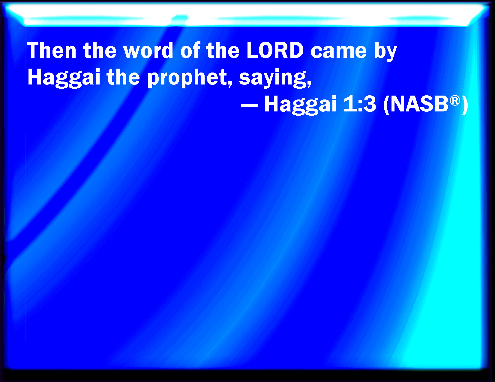 Bible Verse Slide Haggai 1:3 Then came the word of the LORD by Haggai the prophet, saying, KJV: Then came the word of the LORD by Haggai the prophet, saying, DRB: And the word of the Lord came by the hand of Aggeus the prophet, saying: DBT: And the word of Jehovah came by Haggai the prophet, saying, ERV: Then came the word of the LORD by Haggai the prophet, saying, WBT: Then came the word of the LORD by Haggai the prophet, saying, WEB: Then the Word of Yahweh came by Haggai, the prophet, saying, YLT: And there is a word of Jehovah by the hand of Haggai the prophet, saying:Links Haggai 1:3 NIV • Haggai 1:3 NLT • Haggai 1:3 ESV • Haggai 1:3 NASB • Haggai 1:3 KJV • Haggai 1:3 Interlinear • Haggai 1:3 Commentaries • Haggai 1:3 Parallel Texts • Haggai 1:3 Bible Apps • Haggai 1:3 Parallel • Bible Hub |