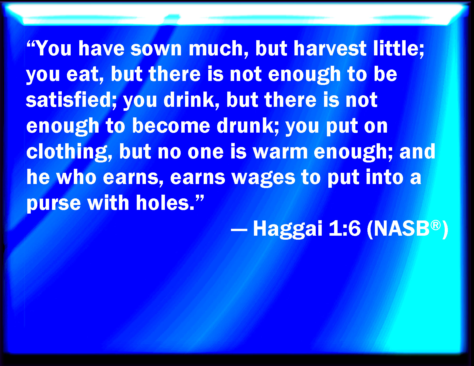Bible Verse Slide Haggai 1:6 You have sown much, and bring in little; you eat, but you have not enough; you drink, but you are not filled with drink; you clothe you, but there is none warm; and he that earns wages earns wages to put it into a bag with holes. KJV: Ye have sown much, and bring in little; ye eat, but ye have not enough; ye drink, but ye are not filled with drink; ye clothe you, but there is none warm; and he that earneth wages earneth wages to put it into a bag with holes. DRB: You have sowed much, and brought in little: you have eaten, but have not had enough: you have drunk, but have not been filled with drink: you have clothed yourselves, but have not been warmed: and he that hath earned wages, put them into a bag with holes. DBT: Ye have sown much, and bring in little; ye eat, but are not satisfied; ye drink, but are not filled with drink; ye clothe yourselves, but there is none warm; and he that earneth wages earneth wages for a bag with holes. ERV: Ye have sown much, and bring in little; ye eat, but ye have not enough; ye drink, but ye are not filled with drink; ye clothe you, but there is none warm; and he that earneth wages earneth wages to put it into a bag with holes. WBT: Ye have sown much, and bring in little; ye eat, but ye have not enough; ye drink, but ye are not filled with drink; ye clothe yourselves, but there is none warm; and he that earneth wages earneth wages to put it into a bag with holes. WEB: You have sown much, and bring in little. You eat, but you don't have enough. You drink, but you aren't filled with drink. You clothe yourselves, but no one is warm, and he who earns wages earns wages to put them into a bag with holes in it." YLT: Ye have sown much, and brought in little, To eat, and not to satiety, To drink, and not to drunkenness, To clothe, and none hath heat, And he who is hiring himself out, Is hiring himself for a bag pierced through.Links Haggai 1:6 NIV • Haggai 1:6 NLT • Haggai 1:6 ESV • Haggai 1:6 NASB • Haggai 1:6 KJV • Haggai 1:6 Interlinear • Haggai 1:6 Commentaries • Haggai 1:6 Parallel Texts • Haggai 1:6 Bible Apps • Haggai 1:6 Parallel • Bible Hub |