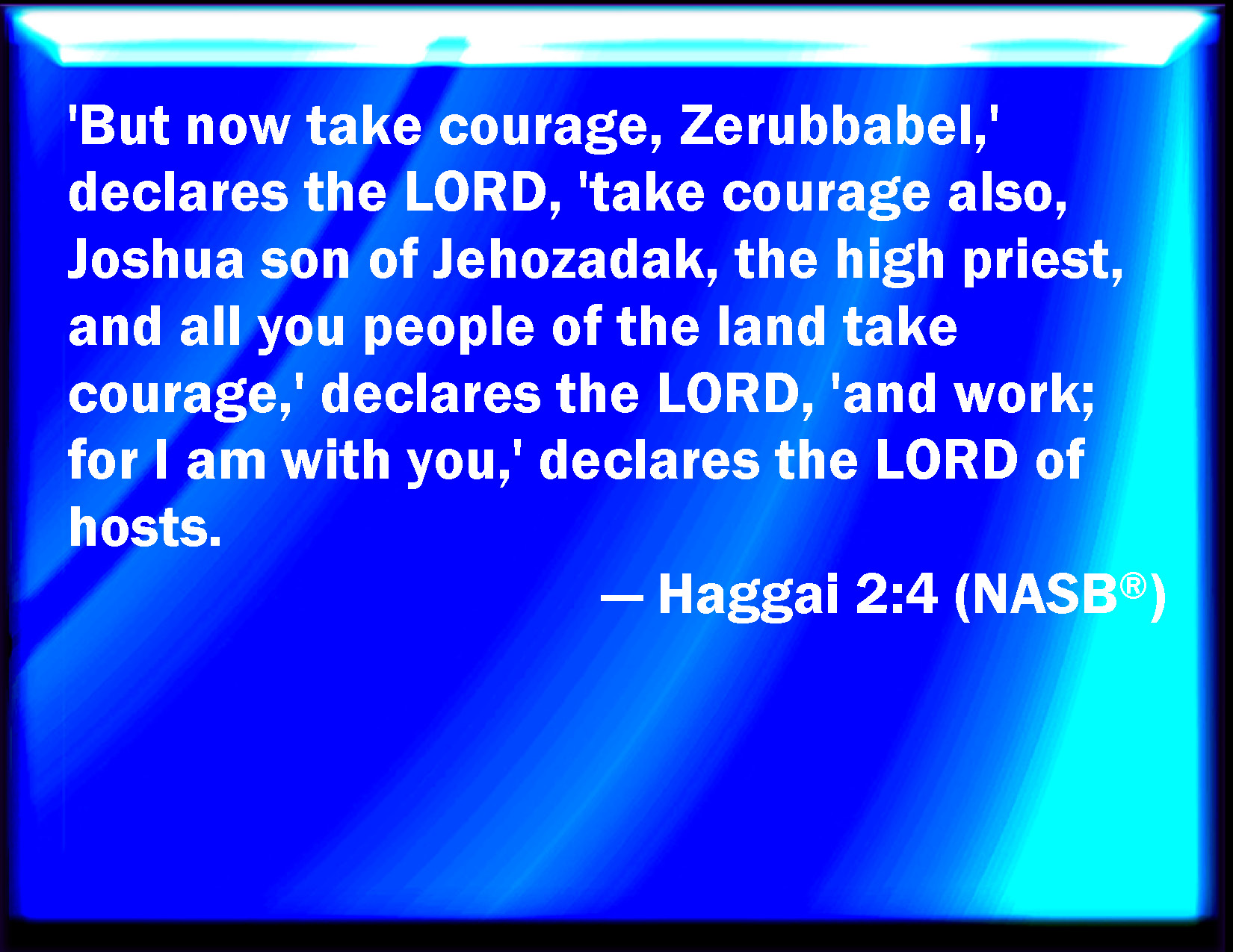 Bible Verse Slide Haggai 2:4 Yet now be strong, O Zerubbabel, said the LORD; and be strong, O Joshua, son of Josedech, the high priest; and be strong, all you people of the land, said the LORD, and work: for I am with you, said the LORD of hosts: KJV: Yet now be strong, O Zerubbabel, saith the LORD; and be strong, O Joshua, son of Josedech, the high priest; and be strong, all ye people of the land, saith the LORD, and work: for I am with you, saith the LORD of hosts: DRB: Yet now take courage, O Zorobabel, saith the Lord, and take courage, O Jesus the son of Josedec the high priest, and take courage, all ye people of the land, saith the Lord of hosts: and perform (for I am with you, saith the Lord of hosts) DBT: But now be strong, Zerubbabel, saith Jehovah; and be strong, Joshua son of Jehozadak, the high priest; and be strong, all ye people of the land, saith Jehovah, and work: for I am with you, saith Jehovah of hosts. ERV: Yet now be strong, O Zerubbabel, saith the LORD; and be strong, O Joshua, son of Jehozadak, the high priest; and be strong, all ye people of the land, saith the LORD, and work: for I am with you, saith the LORD of hosts, WBT: Yet now be strong, O Zerubbabel, saith the LORD; and be strong, O Joshua, son of Josedech, the high priest; and be strong, all ye people of the land, saith the LORD, and work: for I am with you, saith the LORD of hosts: WEB: Yet now be strong, Zerubbabel,' says Yahweh. 'Be strong, Joshua, son of Jehozadak, the high priest. Be strong, all you people of the land,' says Yahweh, 'and work, for I am with you,' says Yahweh of Armies. YLT: And now, be strong, O Zerubbabel, An affirmation of Jehovah, And be strong, O Joshua, son of Josedech, the high priest, And be strong, all ye people of the land, An affirmation of Jehovah, And do ye — (for I am with you, An affirmation of Jehovah of Hosts) — Links Haggai 2:4 NIV • Haggai 2:4 NLT • Haggai 2:4 ESV • Haggai 2:4 NASB • Haggai 2:4 KJV • Haggai 2:4 Interlinear • Haggai 2:4 Commentaries • Haggai 2:4 Parallel Texts • Haggai 2:4 Bible Apps • Haggai 2:4 Parallel • Bible Hub |