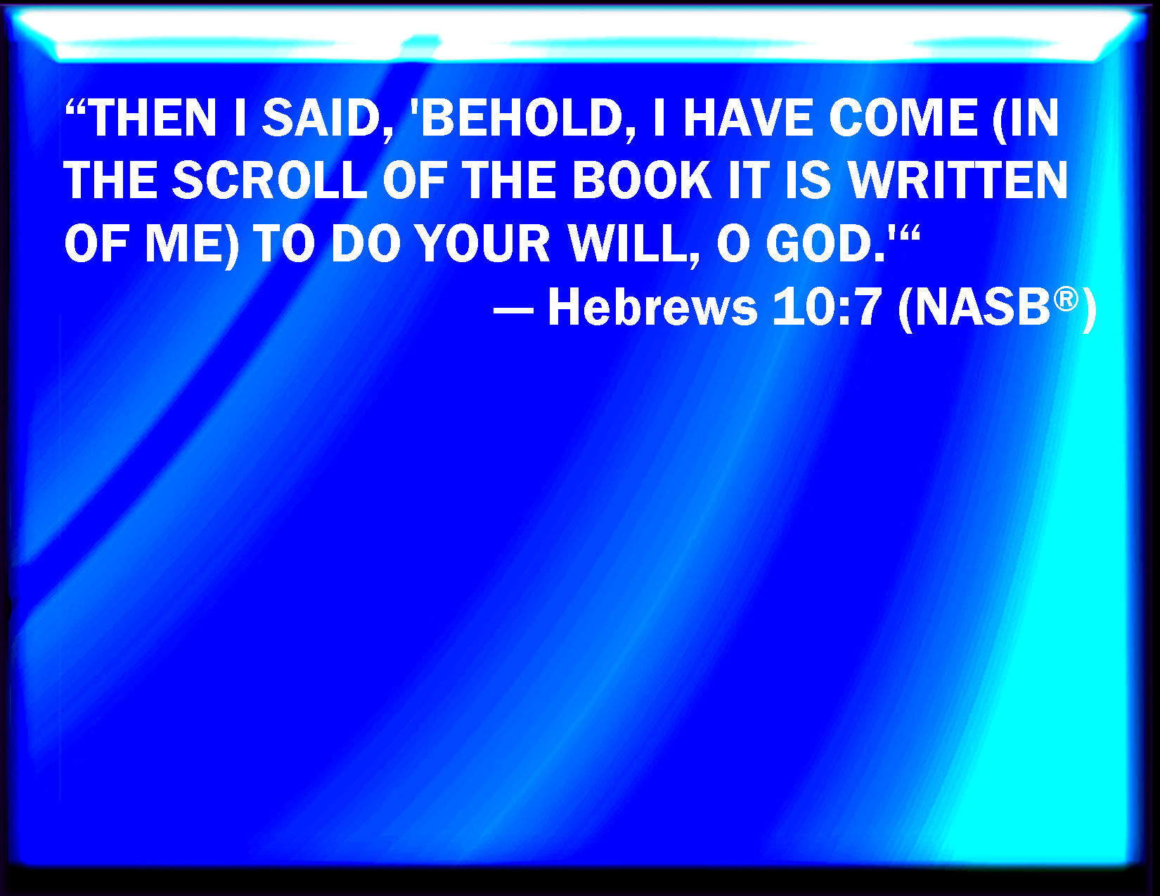 Bible Verse Slide Hebrews 10:7 Then said I, See, I come (in the volume of the book it is written of me,) to do your will, O God. KJV: Then said I, Lo, I come (in the volume of the book it is written of me,) to do thy will, O God. DRB: Then said I: Behold I come: in the head of the book it is written of me: that I should do thy will, O God. DBT: Then I said, Lo, I come (in the roll of the book it is written of me) to do, O God, thy will. ERV: Then said I, Lo, I am come (In the roll of the book it is written of me) To do thy will, O God. WBT: Then said I, Lo, I come (in the volume of the book it is written concerning me,) to do thy will, O God. WEB: Then I said, 'Behold, I have come (in the scroll of the book it is written of me) to do your will, O God.'" YLT: then I said, Lo, I come, (in a volume of the book it hath been written concerning me,) to do, O God, Thy will;'Links Hebrews 10:7 NIV • Hebrews 10:7 NLT • Hebrews 10:7 ESV • Hebrews 10:7 NASB • Hebrews 10:7 KJV • Hebrews 10:7 Interlinear • Hebrews 10:7 Commentaries • Hebrews 10:7 Parallel Texts • Hebrews 10:7 Bible Apps • Hebrews 10:7 Parallel • Bible Hub |