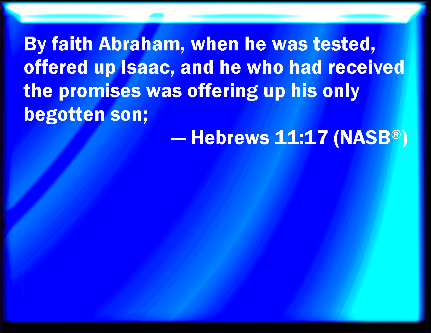 Bible Verse Slide Hebrews 11:17 By faith Abraham, when he was tried, offered up Isaac: and he that had received the promises offered up his only begotten son, KJV: By faith Abraham, when he was tried, offered up Isaac: and he that had received the promises offered up his only begotten son, DRB: By faith Abraham, when he was tried, offered Isaac: and he that had received the promises, offered up his only begotten son; DBT: By faith Abraham, when tried, offered up Isaac, and he who had received to himself the promises offered up his only begotten son, ERV: By faith Abraham, being tried, offered up Isaac: yea, he that had gladly received the promises was offering up his only begotten son; WBT: By faith Abraham, when he was tried, offered up Isaac: and he that had received the promises offered up his only-begotten son, WEB: By faith, Abraham, being tested, offered up Isaac. Yes, he who had gladly received the promises was offering up his one and only son; YLT: By faith Abraham hath offered up Isaac, being tried, and the only begotten he did offer up who did receive the promises,Links Hebrews 11:17 NIV • Hebrews 11:17 NLT • Hebrews 11:17 ESV • Hebrews 11:17 NASB • Hebrews 11:17 KJV • Hebrews 11:17 Interlinear • Hebrews 11:17 Commentaries • Hebrews 11:17 Parallel Texts • Hebrews 11:17 Bible Apps • Hebrews 11:17 Parallel • Bible Hub |