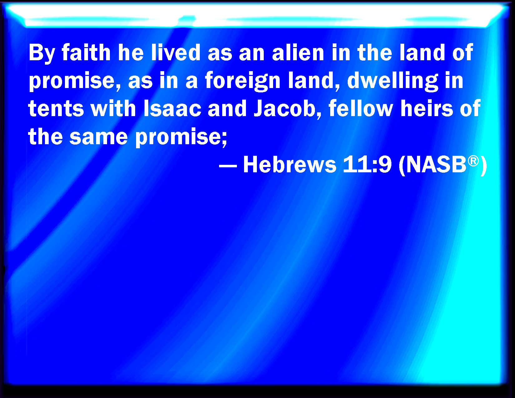 Bible Verse Slide Hebrews 11:9 By faith he sojourned in the land of promise, as in a strange country, dwelling in tabernacles with Isaac and Jacob, the heirs with him of the same promise: KJV: By faith he sojourned in the land of promise, as in a strange country, dwelling in tabernacles with Isaac and Jacob, the heirs with him of the same promise: DRB: By faith he abode in the land, dwelling in cottages, with Isaac and Jacob, the co-heirs of the same promise. DBT: By faith he sojourned as a stranger in the land of promise as a foreign country, having dwelt in tents with Isaac and Jacob, the heirs with him of the same promise; ERV: By faith he became a sojourner in the land of promise, as in a land not his own, dwelling in tents, with Isaac and Jacob, the heirs with him of the same promise: WBT: By faith he sojourned in the land of promise, as in a foreign country, dwelling in tabernacles with Isaac and Jacob, the heirs with him of the same promise: WEB: By faith, he lived as an alien in the land of promise, as in a land not his own, dwelling in tents, with Isaac and Jacob, the heirs with him of the same promise. YLT: by faith he did sojourn in the land of the promise as a strange country, in tabernacles having dwelt with Isaac and Jacob, fellow-heirs of the same promise,Links Hebrews 11:9 NIV • Hebrews 11:9 NLT • Hebrews 11:9 ESV • Hebrews 11:9 NASB • Hebrews 11:9 KJV • Hebrews 11:9 Interlinear • Hebrews 11:9 Commentaries • Hebrews 11:9 Parallel Texts • Hebrews 11:9 Bible Apps • Hebrews 11:9 Parallel • Bible Hub |