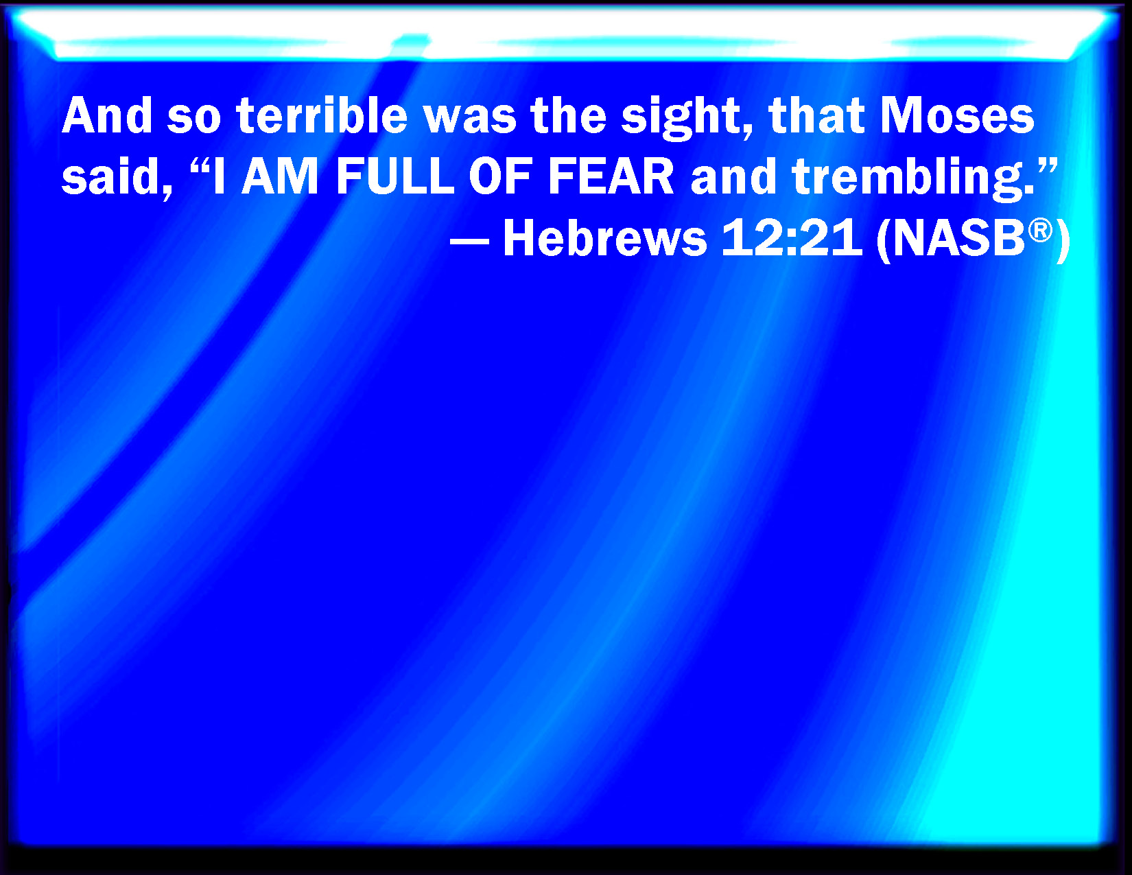 Bible Verse Slide Hebrews 12:21 And so terrible was the sight, that Moses said, I exceedingly fear and quake:) KJV: And so terrible was the sight, that Moses said, I exceedingly fear and quake:) DRB: And so terrible was that which was seen, Moses said: I am frighted, and tremble. DBT: and, so fearful was the sight, Moses said, I am exceedingly afraid and full of trembling;) ERV: and so fearful was the appearance, that Moses said, I exceedingly fear and quake: WBT: And so terrible was the sight, that Moses said, I exceedingly fear and tremble:) WEB: and so fearful was the appearance, that Moses said, "I am terrified and trembling." YLT: and, (so terrible was the sight,) Moses said, 'I am fearful exceedingly, and trembling.'Links Hebrews 12:21 NIV • Hebrews 12:21 NLT • Hebrews 12:21 ESV • Hebrews 12:21 NASB • Hebrews 12:21 KJV • Hebrews 12:21 Interlinear • Hebrews 12:21 Commentaries • Hebrews 12:21 Parallel Texts • Hebrews 12:21 Bible Apps • Hebrews 12:21 Parallel • Bible Hub |