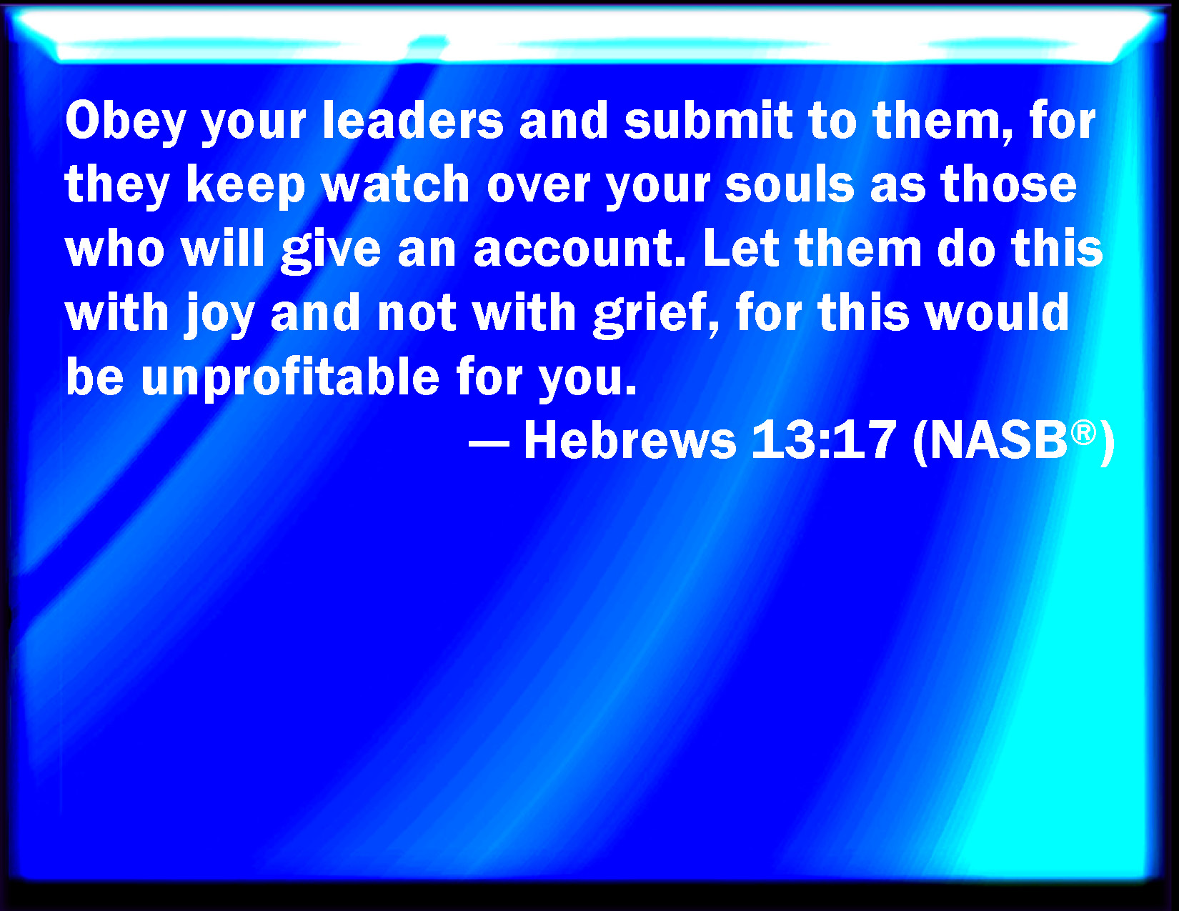 Bible Verse Slide Hebrews 13:17 Obey them that have the rule over you, and submit yourselves: for they watch for your souls, as they that must give account, that they may do it with joy, and not with grief: for that is unprofitable for you. KJV: Obey them that have the rule over you, and submit yourselves: for they watch for your souls, as they that must give account, that they may do it with joy, and not with grief: for that is unprofitable for you. DRB: Obey your prelates, and be subject to them. For they watch as being to render an account of your souls; that they may do this with joy, and not with grief. For this is not expedient for you. DBT: Obey your leaders, and be submissive; for they watch over your souls as those that shall give account; that they may do this with joy, and not groaning, for this would be unprofitable for you. ERV: Obey them that have the rule over you, and submit to them: for they watch in behalf of your souls, as they that shall give account; that they may do this with joy, and not with grief: for this were unprofitable for you. WBT: Obey them that have the rule over you, and submit yourselves: for they watch for your souls, as they that must give account, that they may do it with joy, and not with grief: for that is unprofitable for you. WEB: Obey your leaders and submit to them, for they watch on behalf of your souls, as those who will give account, that they may do this with joy, and not with groaning, for that would be unprofitable for you. YLT: Be obedient to those leading you, and be subject, for these do watch for your souls, as about to give account, that with joy they may do this, and not sighing, for this is unprofitable to you.Links Hebrews 13:17 NIV • Hebrews 13:17 NLT • Hebrews 13:17 ESV • Hebrews 13:17 NASB • Hebrews 13:17 KJV • Hebrews 13:17 Interlinear • Hebrews 13:17 Commentaries • Hebrews 13:17 Parallel Texts • Hebrews 13:17 Bible Apps • Hebrews 13:17 Parallel • Bible Hub |