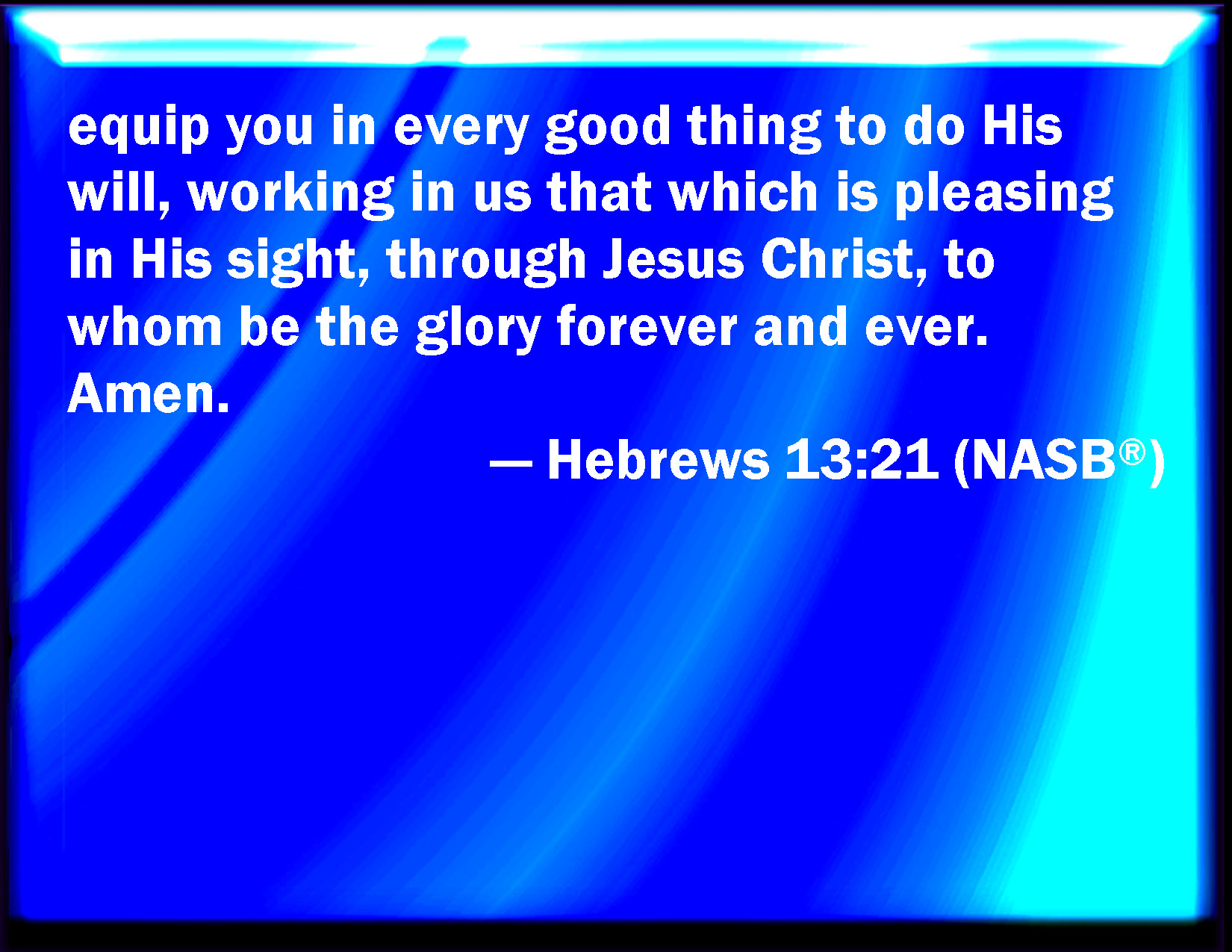 Bible Verse Slide Hebrews 13:21 Make you perfect in every good work to do his will, working in you that which is well pleasing in his sight, through Jesus Christ; to whom be glory for ever and ever. Amen. KJV: Make you perfect in every good work to do his will, working in you that which is wellpleasing in his sight, through Jesus Christ; to whom be glory for ever and ever. Amen. DRB: Fit you in all goodness, that you may do his will; doing in you that which is well pleasing in his sight, through Jesus Christ, to whom is glory for ever and ever. Amen. DBT: perfect you in every good work to the doing of his will, doing in you what is pleasing before him through Jesus Christ; to whom be glory for the ages of ages. Amen. ERV: make you perfect in every good thing to do his will, working in us that which is well-pleasing in his sight, through Jesus Christ; to whom be the glory for ever and ever. Amen. WBT: Make you perfect in every good work to do his will, working in you that which is well-pleasing in his sight, through Jesus Christ; to whom be glory for ever and ever. Amen. WEB: make you complete in every good work to do his will, working in you that which is well pleasing in his sight, through Jesus Christ, to whom be the glory forever and ever. Amen. YLT: make you perfect in every good work to do His will, doing in you that which is well-pleasing before Him, through Jesus Christ, to whom is the glory — to the ages of the ages! Amen.Links Hebrews 13:21 NIV • Hebrews 13:21 NLT • Hebrews 13:21 ESV • Hebrews 13:21 NASB • Hebrews 13:21 KJV • Hebrews 13:21 Interlinear • Hebrews 13:21 Commentaries • Hebrews 13:21 Parallel Texts • Hebrews 13:21 Bible Apps • Hebrews 13:21 Parallel • Bible Hub |