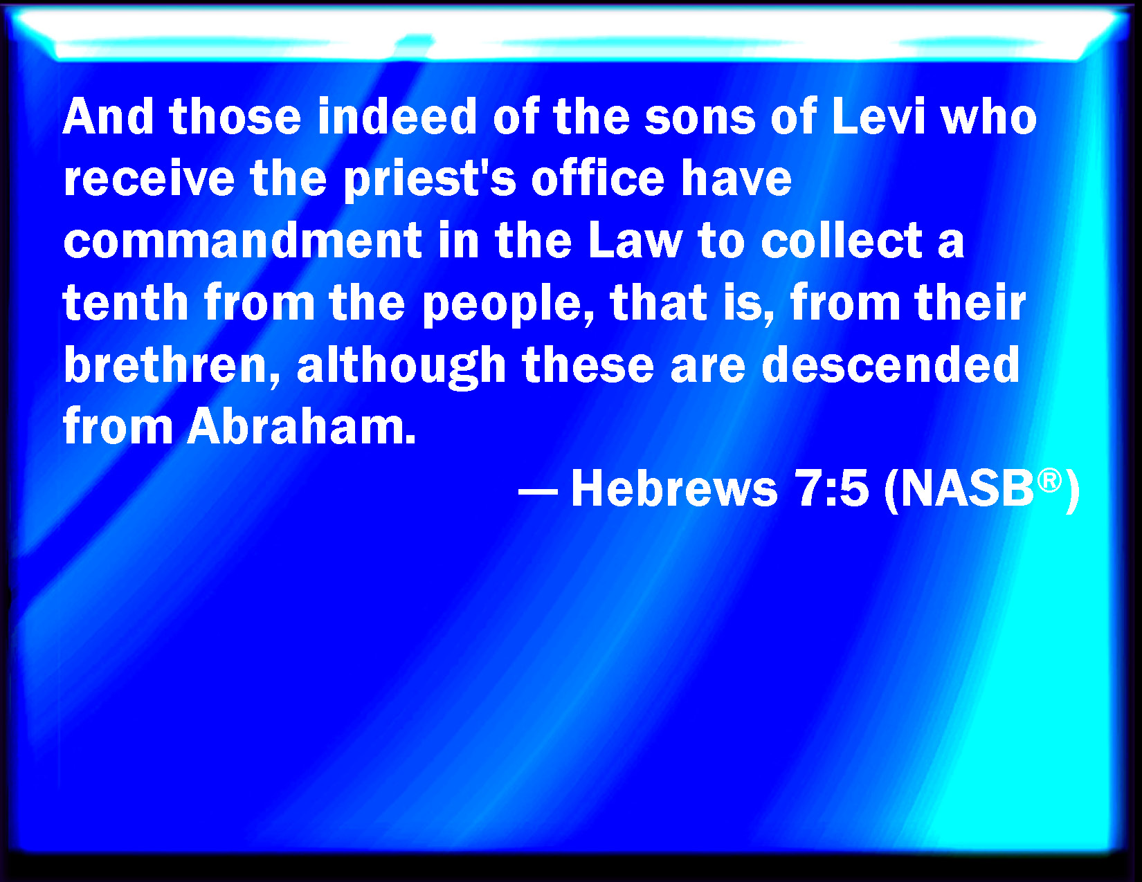 Bible Verse Slide Hebrews 7:5 And truly they that are of the sons of Levi, who receive the office of the priesthood, have a commandment to take tithes of the people according to the law, that is, of their brothers, though they come out of the loins of Abraham: KJV: And verily they that are of the sons of Levi, who receive the office of the priesthood, have a commandment to take tithes of the people according to the law, that is, of their brethren, though they come out of the loins of Abraham: DRB: And indeed they that are of the sons of Levi, who receive the priesthood, have a commandment to take tithes of the people according to the law, that is to say, of their brethren: though they themselves also came out of the loins of Abraham. DBT: And they indeed from among the sons of Levi, who receive the priesthood, have commandment to take tithes from the people according to the law, that is from their brethren, though these are come out of the loins of Abraham: ERV: And they indeed of the sons of Levi that receive the priest's office have commandment to take tithes of the people according to the law, that is, of their brethren, though these have come out of the loins of Abraham: WBT: And verily they that are of the sons of Levi, who receive the office of the priesthood, have a commandment to take tithes from the people according to the law, that is, from their brethren, though they come from the loins of Abraham: WEB: They indeed of the sons of Levi who receive the priest's office have a commandment to take tithes of the people according to the law, that is, of their brothers, though these have come out of the body of Abraham, YLT: and those, indeed, out of the sons of Levi receiving the priesthood, a command have to take tithes from the people according to the law, that is, their brethren, even though they came forth out of the loins of Abraham;Links Hebrews 7:5 NIV • Hebrews 7:5 NLT • Hebrews 7:5 ESV • Hebrews 7:5 NASB • Hebrews 7:5 KJV • Hebrews 7:5 Interlinear • Hebrews 7:5 Commentaries • Hebrews 7:5 Parallel Texts • Hebrews 7:5 Bible Apps • Hebrews 7:5 Parallel • Bible Hub |