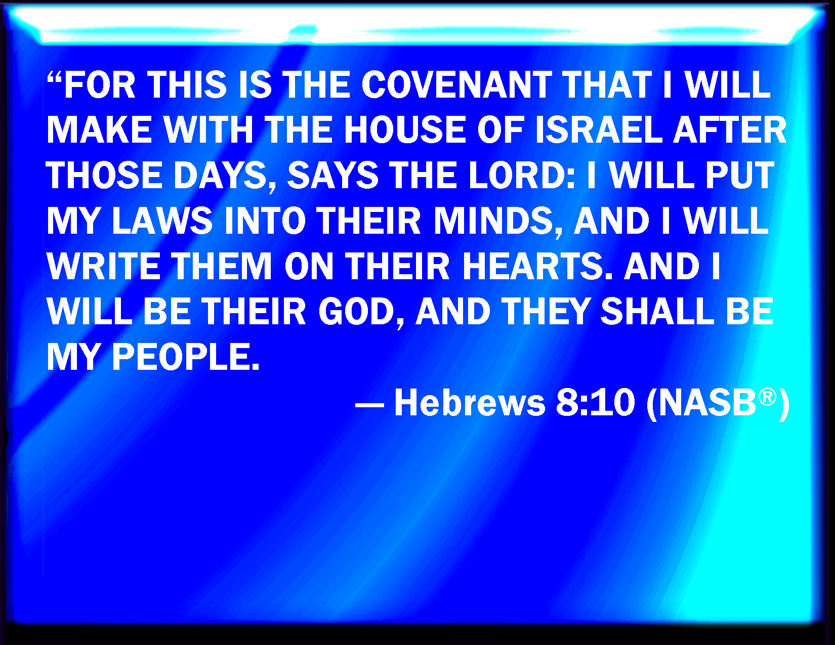 Bible Verse Slide Hebrews 8:10 For this is the covenant that I will make with the house of Israel after those days, said the Lord; I will put my laws into their mind, and write them in their hearts: and I will be to them a God, and they shall be to me a people: KJV: For this is the covenant that I will make with the house of Israel after those days, saith the Lord; I will put my laws into their mind, and write them in their hearts: and I will be to them a God, and they shall be to me a people: DRB: For this is the testament which I will make to the house of Israel after those days, saith the Lord: I will give my laws into their mind, and in their heart will I write them: and I will be their God, and they shall be my people: DBT: Because this is the covenant that I will covenant to the house of Israel after those days, saith the Lord: Giving my laws into their mind, I will write them also upon their hearts; and I will be to them for God, and they shall be to me for people. ERV: For this is the covenant that I will make with the house of Israel After those days, saith the Lord; I will put my laws into their mind, And on their heart also will I write them: And I will be to them a God, And they shall be to me a people: WBT: For this is the covenant that I will make with the house of Israel after those days, saith the Lord; I will put my laws into their mind, and write them in their hearts: and I will be to them a God, and they shall be to me a people: WEB: "For this is the covenant that I will make with the house of Israel. After those days," says the Lord; "I will put my laws into their mind, I will also write them on their heart. I will be their God, and they will be my people. YLT: because this is the covenant that I will make with the house of Israel, after those days, saith the Lord, giving My laws into their mind, and upon their hearts I will write them, and I will be to them for a God, and they shall be to Me for a people;Links Hebrews 8:10 NIV • Hebrews 8:10 NLT • Hebrews 8:10 ESV • Hebrews 8:10 NASB • Hebrews 8:10 KJV • Hebrews 8:10 Interlinear • Hebrews 8:10 Commentaries • Hebrews 8:10 Parallel Texts • Hebrews 8:10 Bible Apps • Hebrews 8:10 Parallel • Bible Hub |