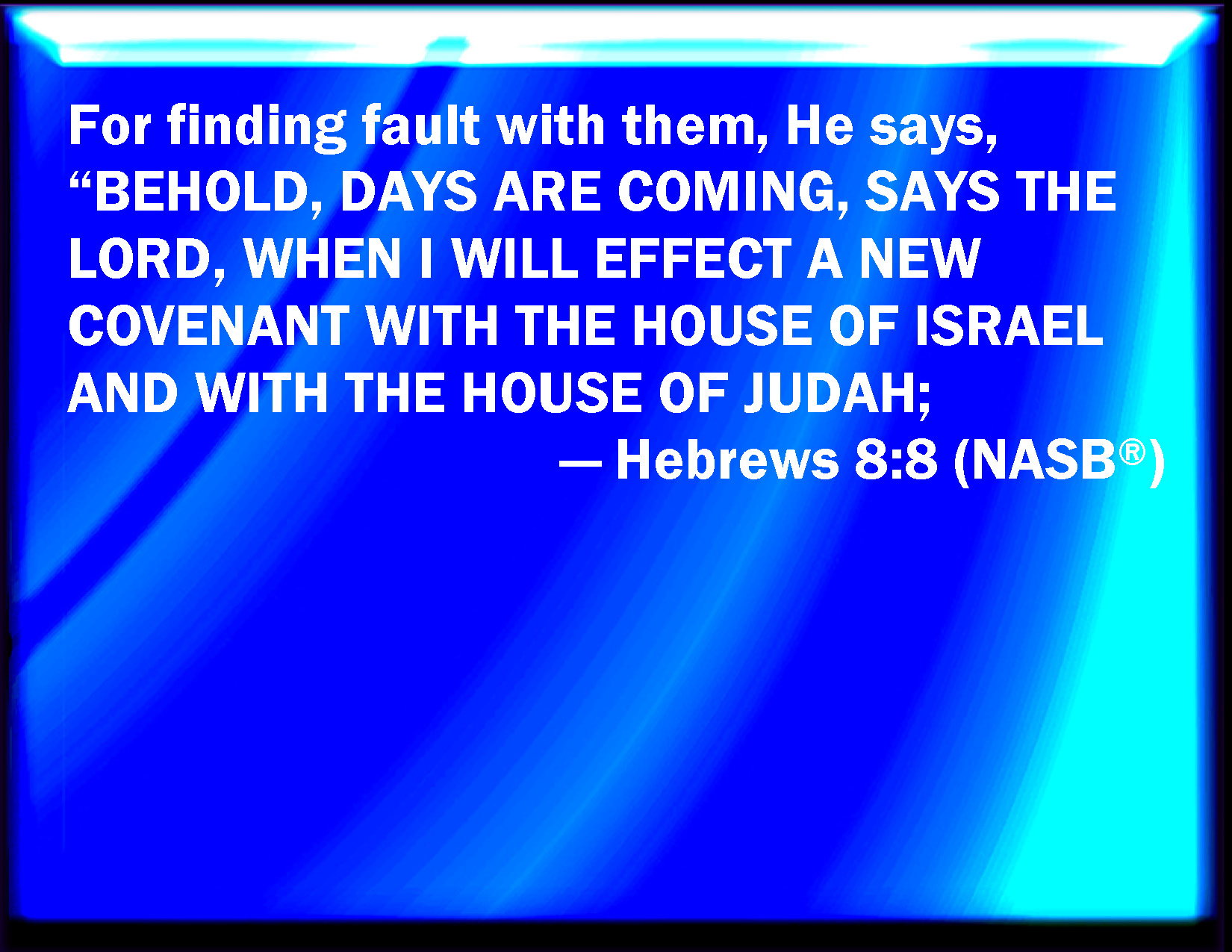 Bible Verse Slide Hebrews 8:8 For finding fault with them, he said, Behold, the days come, said the Lord, when I will make a new covenant with the house of Israel and with the house of Judah: KJV: For finding fault with them, he saith, Behold, the days come, saith the Lord, when I will make a new covenant with the house of Israel and with the house of Judah: DRB: For finding fault with them, he saith: Behold, the days shall come, saith the Lord: and I will perfect unto the house of Israel, and unto the house of Juda, a new testament: DBT: For finding fault, he says to them, Behold, days come, saith the Lord, and I will consummate a new covenant as regards the house of Israel, and as regards the house of Juda; ERV: For finding fault with them, he saith, Behold, the days come, saith the Lord, That I will make a new covenant with the house of Israel and with the house of Judah; WBT: For finding fault with them, he saith, Behold, the days come, saith the Lord, when I will make a new covenant with the house of Israel and with the house of Judah: WEB: For finding fault with them, he said, "Behold, the days come," says the Lord, "that I will make a new covenant with the house of Israel and with the house of Judah; YLT: For finding fault, He saith to them, 'Lo, days come, saith the Lord, and I will complete with the house of Israel, and with the house of Judah, a new covenant,Links Hebrews 8:8 NIV • Hebrews 8:8 NLT • Hebrews 8:8 ESV • Hebrews 8:8 NASB • Hebrews 8:8 KJV • Hebrews 8:8 Interlinear • Hebrews 8:8 Commentaries • Hebrews 8:8 Parallel Texts • Hebrews 8:8 Bible Apps • Hebrews 8:8 Parallel • Bible Hub |