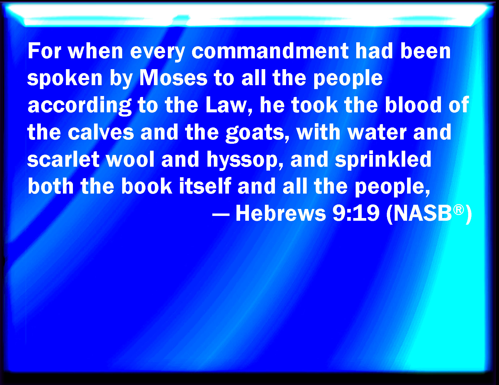 Bible Verse Slide Hebrews 9:19 For when Moses had spoken every precept to all the people according to the law, he took the blood of calves and of goats, with water, and scarlet wool, and hyssop, and sprinkled both the book, and all the people, KJV: For when Moses had spoken every precept to all the people according to the law, he took the blood of calves and of goats, with water, and scarlet wool, and hyssop, and sprinkled both the book, and all the people, DRB: For when every commandment of the law had been read by Moses to all the people, he took the blood of calves and goats, with water, and scarlet wool and hyssop, and sprinkled both the book itself and all the people, DBT: For every commandment having been spoken according to the law by Moses to all the people; having taken the blood of calves and goats, with water and scarlet wool and hyssop, he sprinkled both the book itself and all the people, ERV: For when every commandment had been spoken by Moses unto all the people according to the law, he took the blood of the calves and the goats, with water and scarlet wool and hyssop, and sprinkled both the book itself, and all the people, WBT: For when Moses had spoken every precept to all the people according to the law, he took the blood of calves and of goats, with water, and scarlet wool, and hyssop, and sprinkled both the book and all the people, WEB: For when every commandment had been spoken by Moses to all the people according to the law, he took the blood of the calves and the goats, with water and scarlet wool and hyssop, and sprinkled both the book itself and all the people, YLT: for every command having been spoken, according to law, by Moses, to all the people, having taken the blood of the calves and goats, with water, and scarlet wool, and hyssop, he both the book itself and all the people did sprinkle,Links Hebrews 9:19 NIV • Hebrews 9:19 NLT • Hebrews 9:19 ESV • Hebrews 9:19 NASB • Hebrews 9:19 KJV • Hebrews 9:19 Interlinear • Hebrews 9:19 Commentaries • Hebrews 9:19 Parallel Texts • Hebrews 9:19 Bible Apps • Hebrews 9:19 Parallel • Bible Hub |