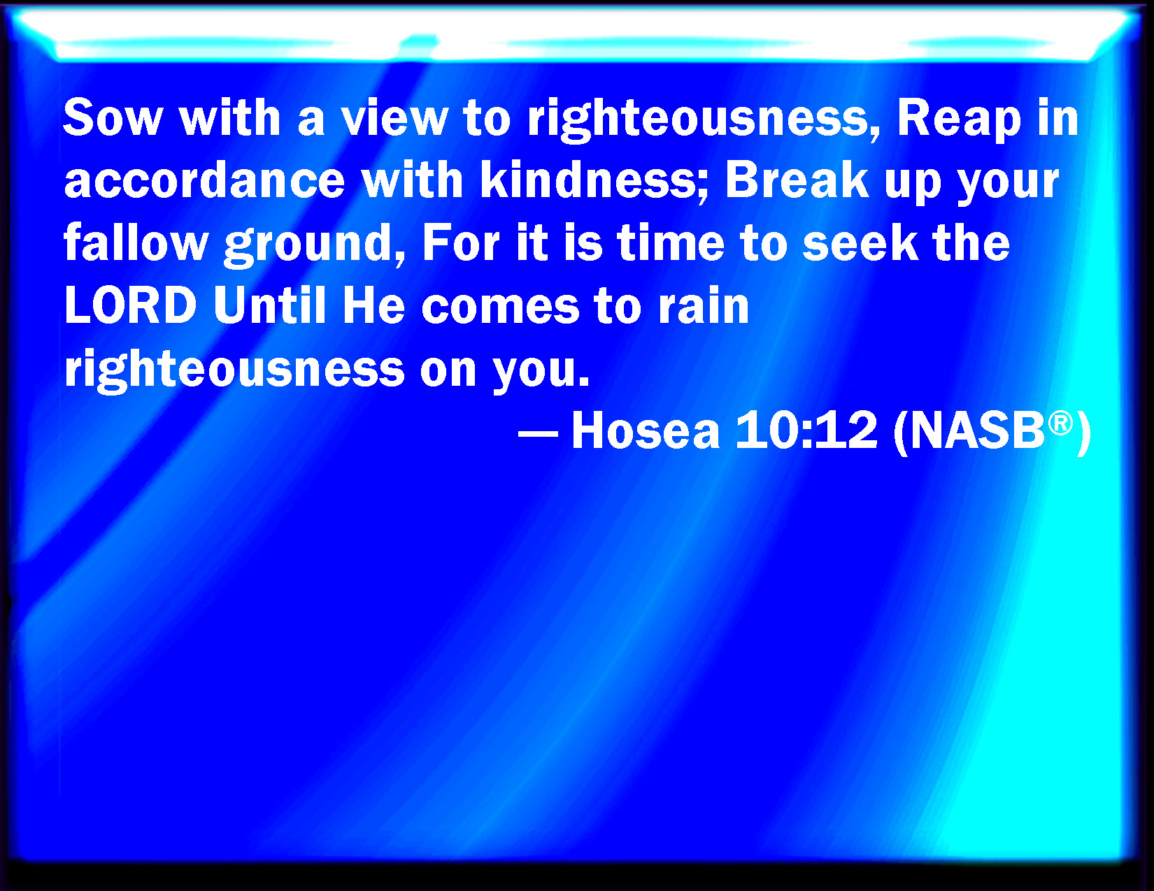 Bible Verse Slide Hosea 10:12 Sow to yourselves in righteousness, reap in mercy; break up your fallow ground: for it is time to seek the LORD, till he come and rain righteousness on you. KJV: Sow to yourselves in righteousness, reap in mercy; break up your fallow ground: for it is time to seek the LORD, till he come and rain righteousness upon you. DRB: Sow for yourselves in justice, and reap in the mouth of mercy, break up your fallow ground: but the time to seek the Lord is, when he shall come that shall teach you justice. DBT: Sow to yourselves in righteousness, reap according to mercy; break up your fallow ground: for it is time to seek Jehovah, till he come and rain righteousness upon you. ERV: Sow to yourselves in righteousness, reap according to mercy; break up your fallow ground: for it is time to seek the LORD, till he come and rain righteousness upon you. WBT: Sow to yourselves in righteousness, reap in mercy; break up your fallow ground: for it is time to seek the LORD, till he shall come and reign righteousness upon you. WEB: Sow to yourselves in righteousness, reap according to kindness. Break up your fallow ground; for it is time to seek Yahweh, until he comes and rains righteousness on you. YLT: Sow for yourselves in righteousness, Reap according to loving-kindness, Till for yourselves tillage of knowledge, To seek Jehovah, Till he come and shew righteousness to you.Links Hosea 10:12 NIV • Hosea 10:12 NLT • Hosea 10:12 ESV • Hosea 10:12 NASB • Hosea 10:12 KJV • Hosea 10:12 Interlinear • Hosea 10:12 Commentaries • Hosea 10:12 Parallel Texts • Hosea 10:12 Bible Apps • Hosea 10:12 Parallel • Bible Hub |