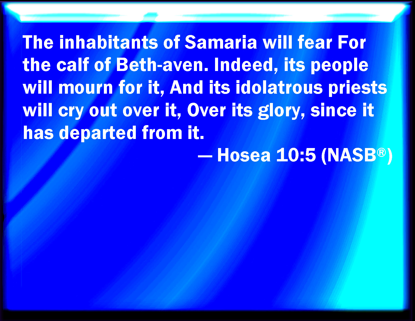Bible Verse Slide Hosea 10:5 The inhabitants of Samaria shall fear because of the calves of Bethaven: for the people thereof shall mourn over it, and the priests thereof that rejoiced on it, for the glory thereof, because it is departed from it. KJV: The inhabitants of Samaria shall fear because of the calves of Bethaven: for the people thereof shall mourn over it, and the priests thereof that rejoiced on it, for the glory thereof, because it is departed from it. DRB: The inhabitants of Samaria have worshipped the king of Bethaven: for the people thereof have mourned over it, and the wardens of its temple that rejoiced over it in its glory because it is departed from it. DBT: The inhabitants of Samaria shall fear because of the calf of Beth-aven; for the people thereof shall mourn over it, and the idolatrous priests thereof shall tremble for it, for its glory, because it is departed from it. ERV: The inhabitants of Samaria shall be in terror for the calves of Beth-aven: for the people thereof shall mourn over it, and the priests thereof that rejoiced over it, for the glory thereof, because it is departed from it. WBT: The inhabitants of Samaria shall fear because of the calves of Beth-aven: for its people shall mourn over it, and its priests that rejoiced on it, for its glory, because it is departed from it. WEB: The inhabitants of Samaria will be in terror for the calves of Beth Aven; for its people will mourn over it, Along with its priests who rejoiced over it, for its glory, because it has departed from it. YLT: For the calves of Beth-Aven fear do inhabitants of Samaria, Surely mourned on account of it hath its people, And its priests on account of it leap about, Because of its honour, for it hath removed from it,Links Hosea 10:5 NIV • Hosea 10:5 NLT • Hosea 10:5 ESV • Hosea 10:5 NASB • Hosea 10:5 KJV • Hosea 10:5 Interlinear • Hosea 10:5 Commentaries • Hosea 10:5 Parallel Texts • Hosea 10:5 Bible Apps • Hosea 10:5 Parallel • Bible Hub |