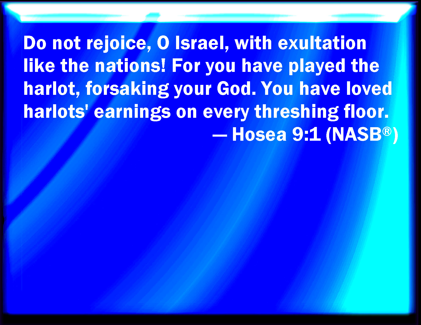 Bible Verse Slide Hosea 9:1 Rejoice not, O Israel, for joy, as other people: for you have gone a whoring from your God, you have loved a reward on every corn floor. KJV: Rejoice not, O Israel, for joy, as other people: for thou hast gone a whoring from thy God, thou hast loved a reward upon every cornfloor. DRB: Rejoice not, O Israel: rejoice not as the nations do: for thou hast committed fornication against thy God, thou hast loved a reward upon every cornfloor. DBT: Rejoice not, Israel, exultingly, as the peoples; for thou hast gone a whoring from thy God, thou hast loved harlot's hire upon every corn-floor. ERV: Rejoice not, O Israel, for joy, like the peoples; for thou hast gone a whoring from thy God, thou hast loved hire upon every cornfloor. WBT: Rejoice not, O Israel, for joy, as other people: for thou hast apostatized from thy God, thou hast loved a reward upon every corn-floor. WEB: Don't rejoice, Israel, to jubilation like the nations; for you were unfaithful to your God. You love the wages of a prostitute at every grain threshing floor. YLT: 'Rejoice not, O Israel, be not joyful like the peoples, For thou hast gone a-whoring from thy God, Thou hast loved a gift near all floors of corn.Links Hosea 9:1 NIV • Hosea 9:1 NLT • Hosea 9:1 ESV • Hosea 9:1 NASB • Hosea 9:1 KJV • Hosea 9:1 Interlinear • Hosea 9:1 Commentaries • Hosea 9:1 Parallel Texts • Hosea 9:1 Bible Apps • Hosea 9:1 Parallel • Bible Hub |