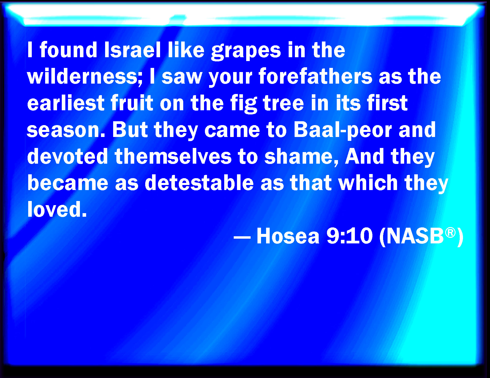 Bible Verse Slide Hosea 9:10 I found Israel like grapes in the wilderness; I saw your fathers as the first ripe in the fig tree at her first time: but they went to Baalpeor, and separated themselves to that shame; and their abominations were according as they loved. KJV: I found Israel like grapes in the wilderness; I saw your fathers as the firstripe in the fig tree at her first time: but they went to Baalpeor, and separated themselves unto that shame; and their abominations were according as they loved. DRB: I found Israel like grapes in the desert, I saw their fathers like the firstfruits of the fig tree in the top thereof: but they went in to Beelphegor, and alienated themselves to that confusion, and became abominable, as those things were, which they loved. DBT: I found Israel as grapes in the wilderness; as first-ripe fruit on the fig-tree, I saw your fathers at the beginning: they went to Baal-Peor, and separated themselves unto that shame, and became abominations like their lover. ERV: I found Israel like grapes in the wilderness; I saw your fathers as the firstripe in the fig tree at her first season: but they came to Baal-peor, and consecrated themselves unto the shameful thing, and became abominable like that which they loved. WBT: I found Israel like grapes in the wilderness; I saw your fathers as the first ripe in the fig-tree at her first time: but they went to Baal-peor, and separated themselves to that shame; and their abominations were according as they loved. WEB: I found Israel like grapes in the wilderness. I saw your fathers as the first ripe in the fig tree at its first season; but they came to Baal Peor, and consecrated themselves to the shameful thing, and became abominable like that which they loved. YLT: As grapes in a wilderness I found Israel, As the first-fruit in a fig-tree, at its beginning, I have seen your fathers, They — they have gone in to Baal-Peor, And are separated to a shameful thing, And are become abominable like their love.Links Hosea 9:10 NIV • Hosea 9:10 NLT • Hosea 9:10 ESV • Hosea 9:10 NASB • Hosea 9:10 KJV • Hosea 9:10 Interlinear • Hosea 9:10 Commentaries • Hosea 9:10 Parallel Texts • Hosea 9:10 Bible Apps • Hosea 9:10 Parallel • Bible Hub |