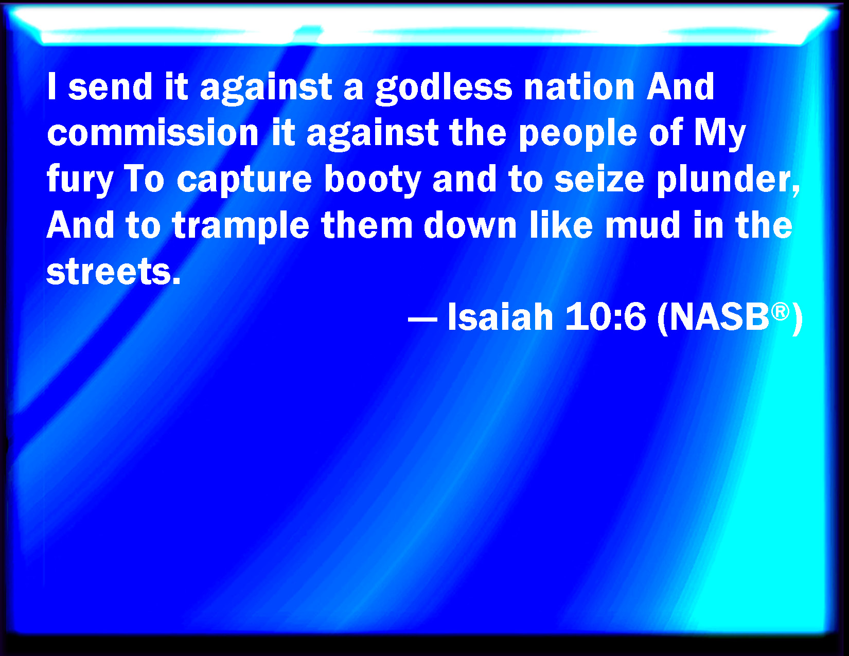 Bible Verse Slide Isaiah 10:6 I will send him against an hypocritical nation, and against the people of my wrath will I give him a charge, to take the spoil, and to take the prey, and to tread them down like the mire of the streets. KJV: I will send him against an hypocritical nation, and against the people of my wrath will I give him a charge, to take the spoil, and to take the prey, and to tread them down like the mire of the streets. DRB: I will send him to a deceitful nation, and I will give him a charge against the people of my wrath, to take away the spoils, and to lay hold on the prey, and to tread them down like the mire of the streets. DBT: I will send him against a hypocritical nation, and against the people of my wrath will I give him a charge; to take the spoil, and to seize the prey, and to tread them down like the mire of the streets. ERV: I will send him against a profane nation, and against the people of my wrath will I give him a charge, to take the spoil, and to take the prey, and to tread them down like the mire of the streets. WBT: I will send him against a hypocritical nation, and against the people of my wrath will I give him a charge, to take the spoil, and to take the prey, and to tread them down like the mire of the streets. WEB: I will send him against a profane nation, and against the people who anger me will I give him a command to take the spoil and to take the prey, and to tread them down like the mire of the streets. YLT: Against a profane nation I send him, And concerning a people of My wrath I charge him, To spoil spoil, and to seize prey, And to make it a treading-place as the clay of out places.Links Isaiah 10:6 NIV • Isaiah 10:6 NLT • Isaiah 10:6 ESV • Isaiah 10:6 NASB • Isaiah 10:6 KJV • Isaiah 10:6 Interlinear • Isaiah 10:6 Commentaries • Isaiah 10:6 Parallel Texts • Isaiah 10:6 Bible Apps • Isaiah 10:6 Parallel • Bible Hub |