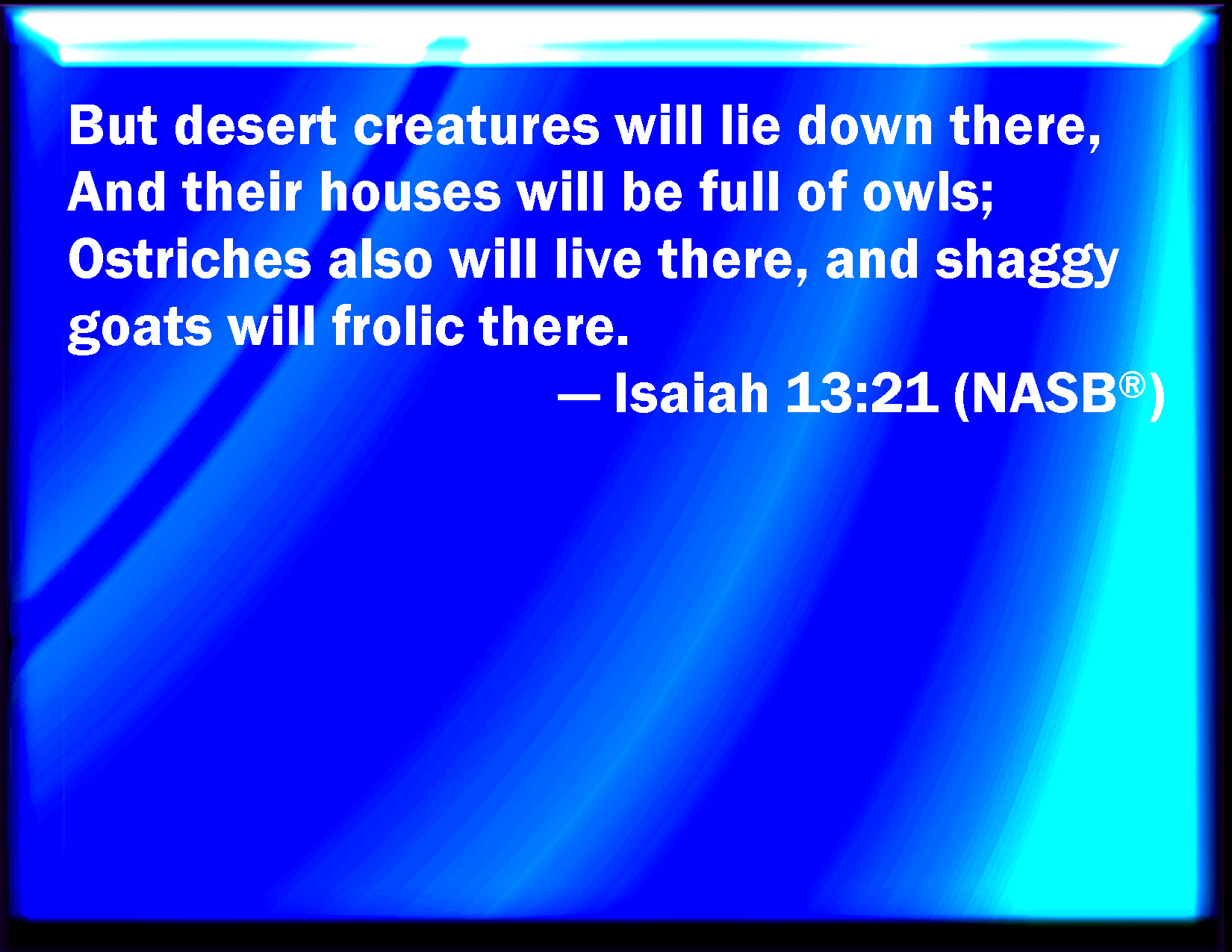Bible Verse Slide Isaiah 13:21 But wild beasts of the desert shall lie there; and their houses shall be full of doleful creatures; and owls shall dwell there, and satyrs shall dance there. KJV: But wild beasts of the desert shall lie there; and their houses shall be full of doleful creatures; and owls shall dwell there, and satyrs shall dance there. DRB: But wild beasts shall rest there, and their houses shall be filled with serpents, and ostriches shall dwell there, and the hairy ones shall dance there: DBT: But beasts of the desert shall lie there, and their houses shall be full of owls; and ostriches shall dwell there, and wild goats shall dance there. ERV: But wild beasts of the desert shall lie there; and their houses shall be full of doleful creatures; and ostriches shall dwell there, and satyrs shall dance there. WBT: But wild beasts of the desert shall lie there; and their houses shall be full of doleful creatures; and owls shall dwell there, and satyrs shall dance there. WEB: But wild animals of the desert will lie there, and their houses will be full of jackals. Ostriches will dwell there, and wild goats will frolic there. YLT: And Ziim have lain down there, And full have been their houses of howlings, And dwelt there have daughters of an ostrich, And goats do skip there.Links Isaiah 13:21 NIV • Isaiah 13:21 NLT • Isaiah 13:21 ESV • Isaiah 13:21 NASB • Isaiah 13:21 KJV • Isaiah 13:21 Interlinear • Isaiah 13:21 Commentaries • Isaiah 13:21 Parallel Texts • Isaiah 13:21 Bible Apps • Isaiah 13:21 Parallel • Bible Hub |