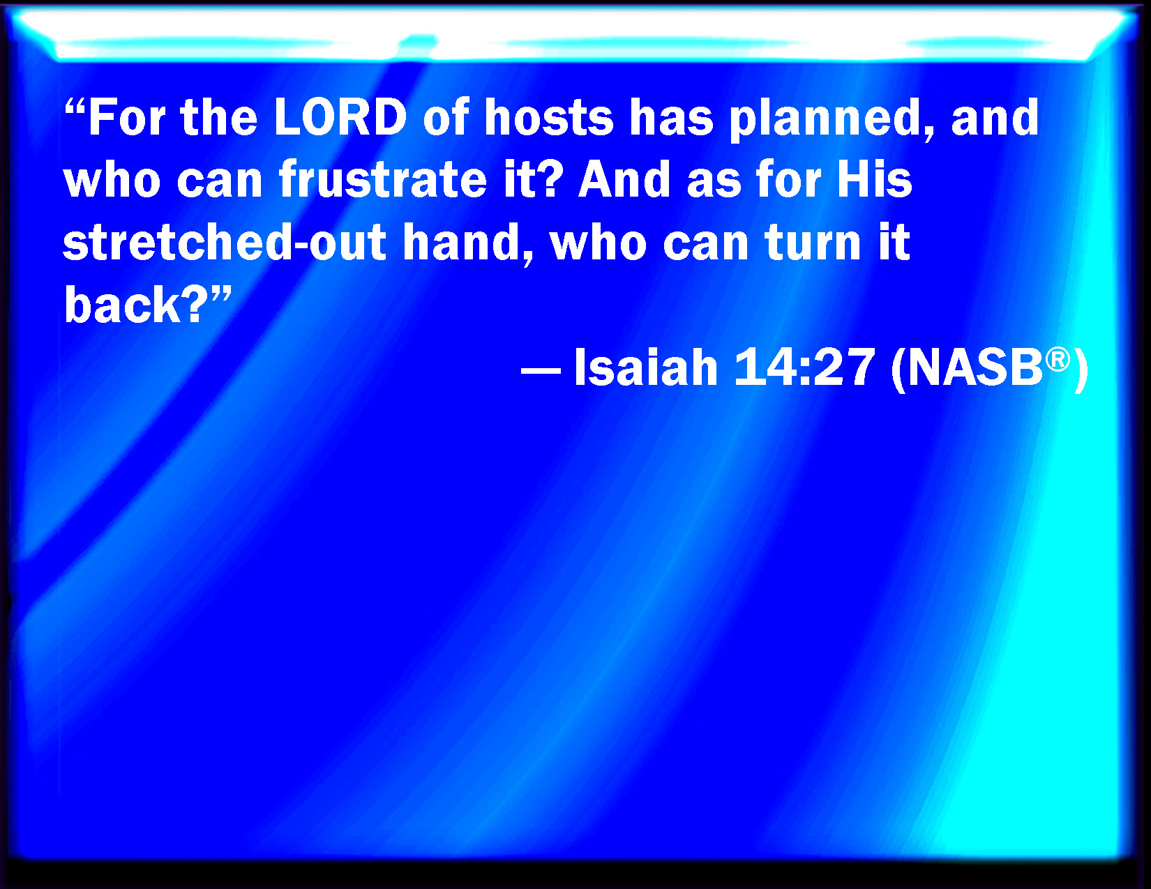 Bible Verse Slide Isaiah 14:27 For the LORD of hosts has purposed, and who shall cancel it? and his hand is stretched out, and who shall turn it back? KJV: For the LORD of hosts hath purposed, and who shall disannul it? and his hand is stretched out, and who shall turn it back? DRB: For the Lord of hosts hath decreed, and who can disannul it? and his hand is stretched out: and who shall turn it away? DBT: For Jehovah of hosts hath purposed, and who shall frustrate it? And his hand is stretched out, and who shall turn it back? ERV: For the LORD of hosts hath purposed, and who shall disannul it? and his hand is stretched out, and who shall turn it back? WBT: For the LORD of hosts hath purposed, and who shall disannul it? and his hand is stretched out, and who shall turn it back? WEB: For Yahweh of Armies has planned, and who can stop it? His hand is stretched out, and who can turn it back?" YLT: For Jehovah of Hosts hath purposed, And who doth make void? And His hand that is stretched out, Who doth turn it back?'Links Isaiah 14:27 NIV • Isaiah 14:27 NLT • Isaiah 14:27 ESV • Isaiah 14:27 NASB • Isaiah 14:27 KJV • Isaiah 14:27 Interlinear • Isaiah 14:27 Commentaries • Isaiah 14:27 Parallel Texts • Isaiah 14:27 Bible Apps • Isaiah 14:27 Parallel • Bible Hub |