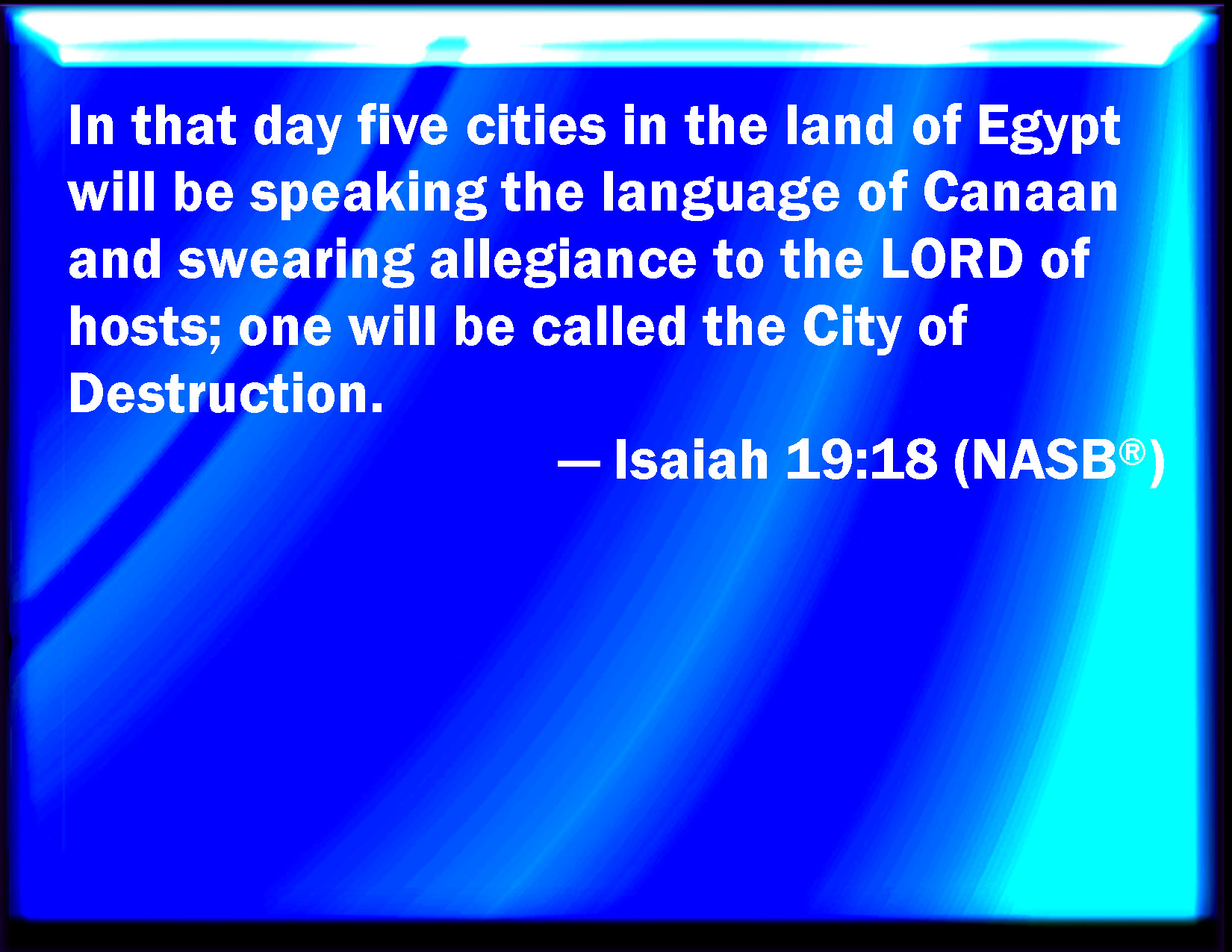 Bible Verse Slide Isaiah 19:18 In that day shall five cities in the land of Egypt speak the language of Canaan, and swear to the LORD of hosts; one shall be called, The city of destruction. KJV: In that day shall five cities in the land of Egypt speak the language of Canaan, and swear to the LORD of hosts; one shall be called, The city of destruction. DRB: In that day there shall be five cities in the land of Egypt, speaking the language of Chanaan, and swearing by the Lord of hosts: one shall be called the city of the sun. DBT: In that day shall there be five cities in the land of Egypt speaking the language of Canaan, and swearing by Jehovah of hosts: one shall be called, The city of Heres. ERV: In that day there shall be five cities in the land of Egypt that speak the language of Canaan, and swear to the LORD of hosts; one shall be called The city of destruction. WBT: In that day shall five cities in the land of Egypt speak the language of Canaan, and swear to the LORD of hosts; one shall be called, The city of destruction. WEB: In that day, there will be five cities in the land of Egypt that speak the language of Canaan, and swear to Yahweh of Armies. One will be called "The city of destruction." YLT: In that day there are five cities in the land of Egypt, Speaking the lip of Canaan, And swearing to Jehovah of Hosts, 'The city of destruction,' is said of one.Links Isaiah 19:18 NIV • Isaiah 19:18 NLT • Isaiah 19:18 ESV • Isaiah 19:18 NASB • Isaiah 19:18 KJV • Isaiah 19:18 Interlinear • Isaiah 19:18 Commentaries • Isaiah 19:18 Parallel Texts • Isaiah 19:18 Bible Apps • Isaiah 19:18 Parallel • Bible Hub |