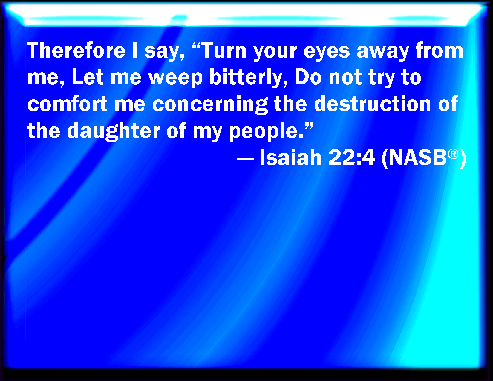 Bible Verse Slide Isaiah 22:4 Therefore said I, Look away from me; I will weep bitterly, labor not to comfort me, because of the spoiling of the daughter of my people. KJV: Therefore said I, Look away from me; I will weep bitterly, labour not to comfort me, because of the spoiling of the daughter of my people. DRB: Therefore have I said: Depart from me, I will weep bitterly: labour not to comfort me, for the devastation of the daughter of my people. DBT: Therefore said I, Look away from me; let me weep bitterly: labour not to comfort me, because of the spoiling of the daughter of my people. ERV: Therefore said I, Look away from me, I will weep bitterly; labour not to comfort me, for the spoiling of the daughter of my people. WBT: Therefore said I, Look away from me; I will weep bitterly, labor not to comfort me, because of the devastation of the daughter of my people. WEB: Therefore I said, "Look away from me. I will weep bitterly. Don't labor to comfort me for the destruction of the daughter of my people. YLT: Therefore I said, 'Look ye from me, I am bitter in my weeping, Haste not to comfort me, For the destruction of the daughter of my people.'Links Isaiah 22:4 NIV • Isaiah 22:4 NLT • Isaiah 22:4 ESV • Isaiah 22:4 NASB • Isaiah 22:4 KJV • Isaiah 22:4 Interlinear • Isaiah 22:4 Commentaries • Isaiah 22:4 Parallel Texts • Isaiah 22:4 Bible Apps • Isaiah 22:4 Parallel • Bible Hub |
