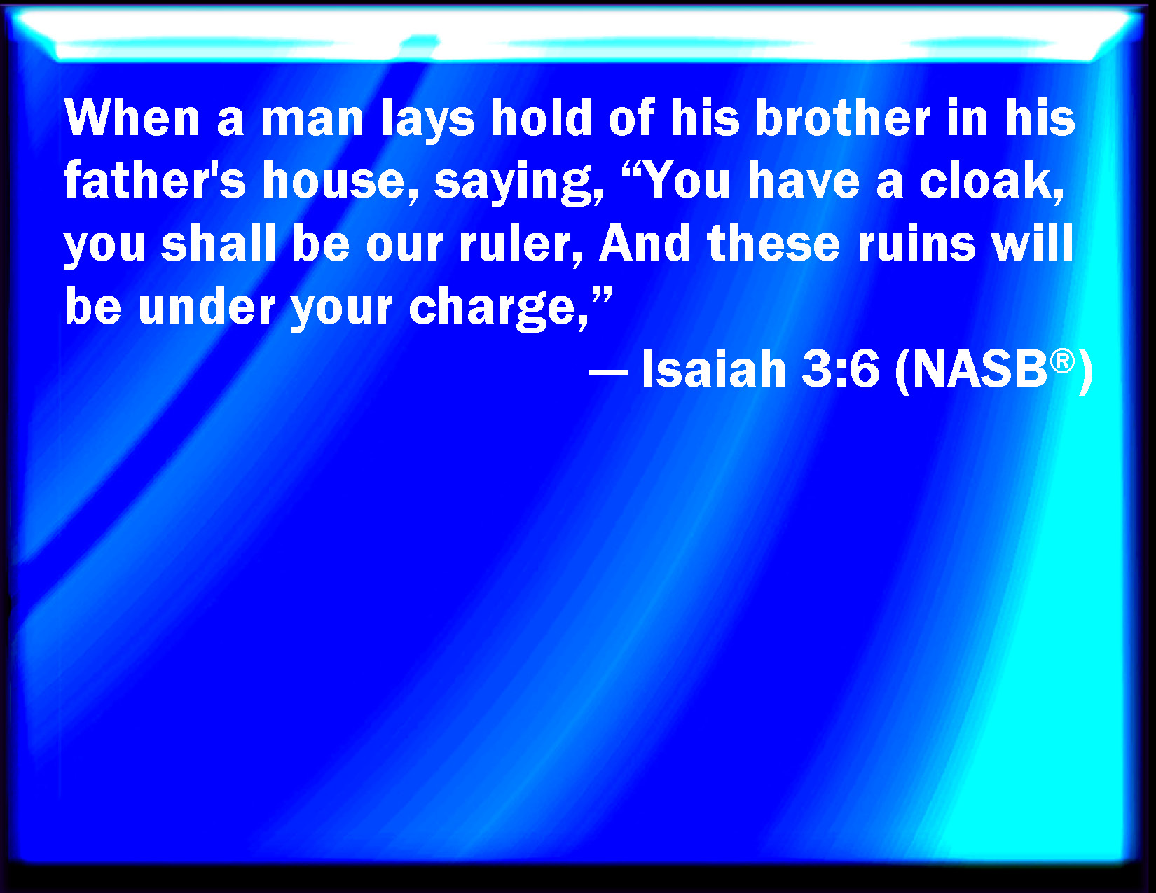 Bible Verse Slide Isaiah 3:6 When a man shall take hold of his brother of the house of his father, saying, You have clothing, be you our ruler, and let this ruin be under your hand: KJV: When a man shall take hold of his brother of the house of his father, saying, Thou hast clothing, be thou our ruler, and let this ruin be under thy hand: DRB: For a man shall take hold or his brother, one of the house of his father, saying: Thou hast a garment, be thou our ruler, and let this ruin be under thy hand. DBT: When a man shall take hold of his brother, in his father's house, and shall say: Thou hast clothing; be our chief, and let this ruin be under thy hand; ERV: When a man shall take hold of his brother in the house of his father, saying, Thou hast clothing, be thou our ruler, and let this ruin be under thy hand: WBT: When a man shall take hold of his brother of the house of his father, saying, Thou hast clothing, be thou our ruler, and let this ruin be under thy hand: WEB: Indeed a man shall take hold of his brother in the house of his father, saying, "You have clothing, you be our ruler, and let this ruin be under your hand." YLT: When one layeth hold on his brother, Of the house of his father, by the garment, 'Come, a ruler thou art to us, And this ruin is under thy hand.'Links Isaiah 3:6 NIV • Isaiah 3:6 NLT • Isaiah 3:6 ESV • Isaiah 3:6 NASB • Isaiah 3:6 KJV • Isaiah 3:6 Interlinear • Isaiah 3:6 Commentaries • Isaiah 3:6 Parallel Texts • Isaiah 3:6 Bible Apps • Isaiah 3:6 Parallel • Bible Hub |