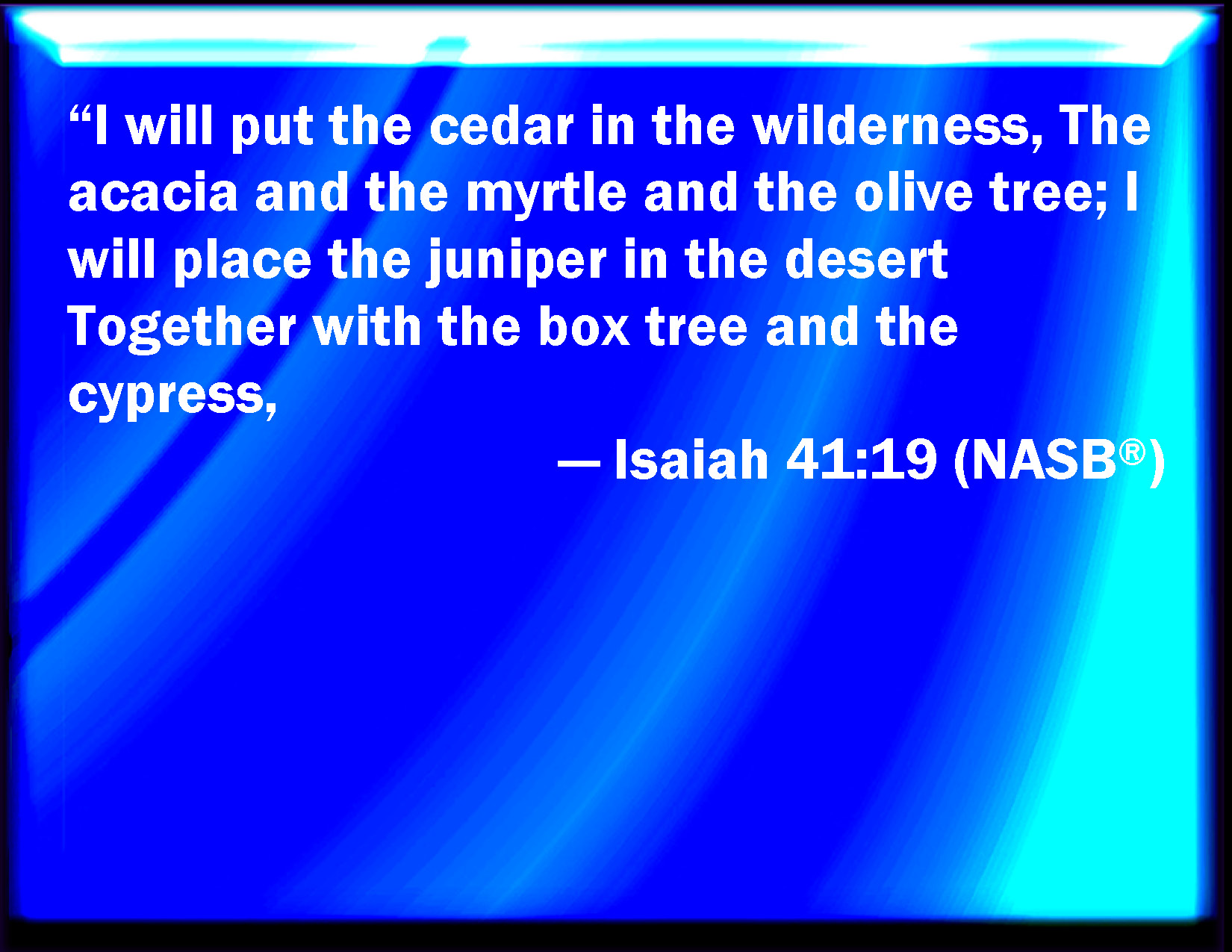 Bible Verse Slide Isaiah 41:19 I will plant in the wilderness the cedar, the shittah tree, and the myrtle, and the oil tree; I will set in the desert the fir tree, and the pine, and the box tree together: KJV: I will plant in the wilderness the cedar, the shittah tree, and the myrtle, and the oil tree; I will set in the desert the fir tree, and the pine, and the box tree together: DRB: I will plant in the wilderness the cedar, and the thorn, and the myrtle, and the olive tree: I will set in the desert the fir tree, the elm, and the box tree together: DBT: I will give in the wilderness the cedar, acacia, myrtle, and oleaster; I will set in the desert the cypress, pine, and box-tree together; ERV: I will plant in the wilderness the cedar, the acacia tree, and the myrtle, and the oil tree; I will set in the desert the fir tree, the pine, and the box tree together: WBT: I will plant in the wilderness the cedar, the shittah-tree, and the myrtle, and the oil-tree; I will set in the desert the fir-tree, the pine, and the box-tree together: WEB: I will put cedar, acacia, myrtle, and oil trees in the wilderness. I will set fir trees, pine, and box trees together in the desert; YLT: I give in a wilderness the cedar, Shittah, and myrtle, and oil-tree, I set in a desert the fir-pine and box-wood together.Links Isaiah 41:19 NIV • Isaiah 41:19 NLT • Isaiah 41:19 ESV • Isaiah 41:19 NASB • Isaiah 41:19 KJV • Isaiah 41:19 Interlinear • Isaiah 41:19 Commentaries • Isaiah 41:19 Parallel Texts • Isaiah 41:19 Bible Apps • Isaiah 41:19 Parallel • Bible Hub |